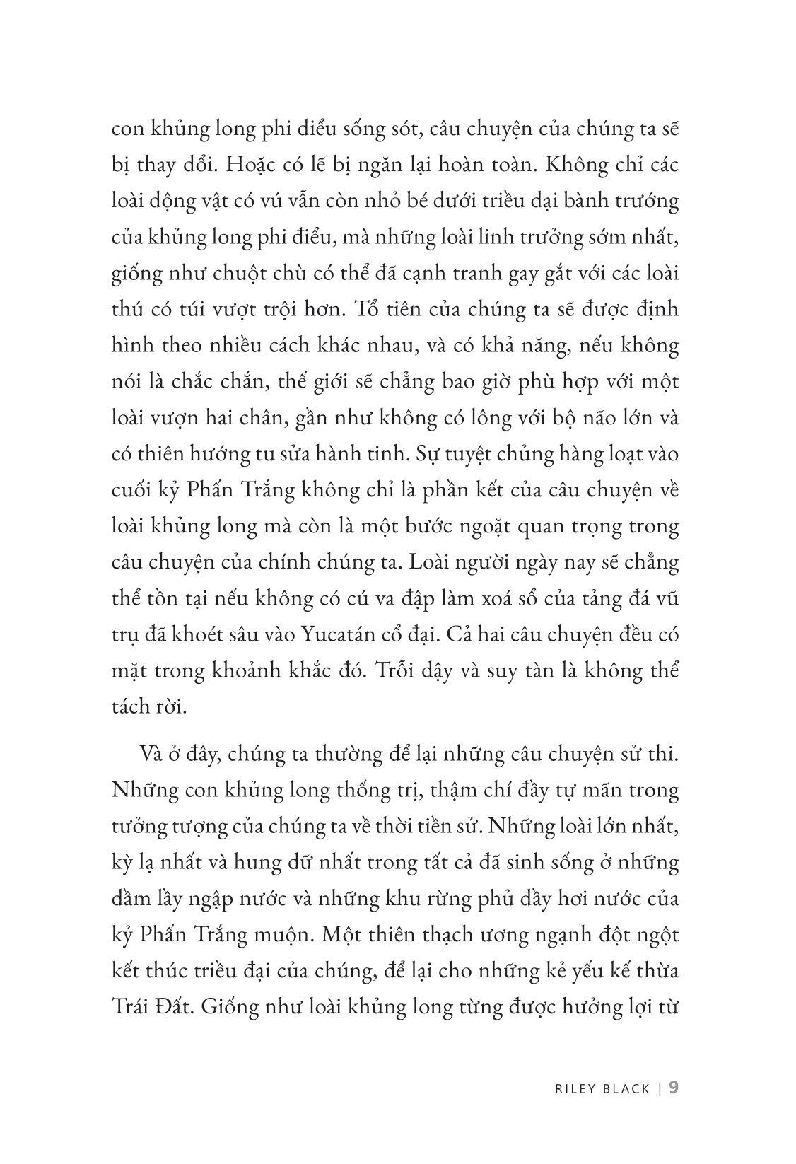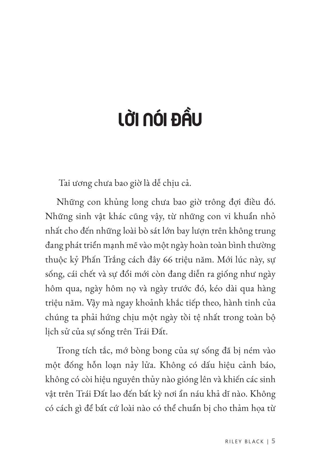 Ấy vậy mà thế giới như chúng ta biết ngày hôm nay lại chính là sự nảy nở tiếp sau thảm họa kéo dài, khi mà sự sống không chỉ quay trở lại mà còn được định hình lại bởi chính thảm họa đó. Dưới một góc độ rất chuẩn xác về khoa học nhưng cũng đầy nhân văn, tác giả Riley Black đã tiếp cận đại thảm họa khi xưa như một câu chuyện bi kịch nhưng giàu hy vọng về bản chất mạnh mẽ của sự sống trên hành tinh của chúng ta.