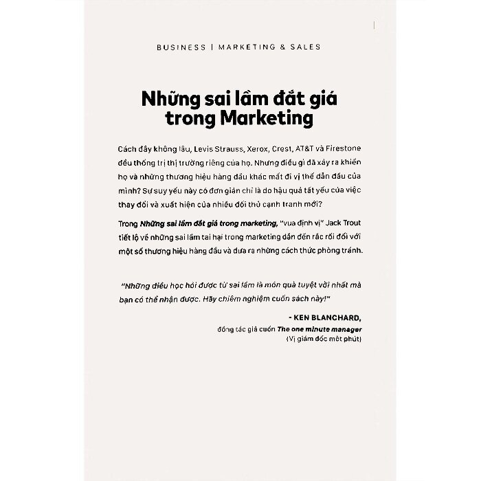 Trong Những sai lầm đắt giá trong Marketing, “vua định vị” Jack Trout tiết lộ về những sai lầm tai hại trong marketing dẫn đến rắc rối đối với một số thương hiệu hàng đầu và đưa ra những phân tích cụ thể về các cách thức giúp tránh được những sai lầm đó.
