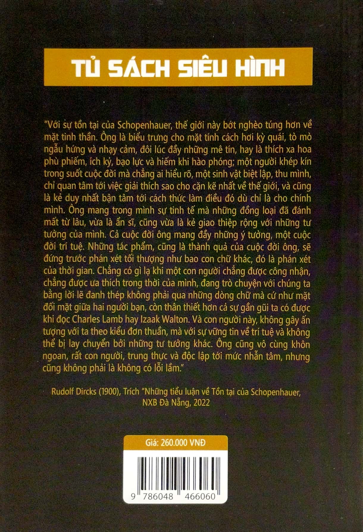 Mua tại TiktokArthur Schopenhauer (1788 – 1860): là một nhà triết học duy tâm người Đức. Ông là một trong những nhà tư tưởng phương Tây thế hệ đầu chia sẻ nhiều điểm chung với triết học Ấn Độ, chẳng hạn như sự khổ tu, sự chối bỏ bản thân, và ý niệm cho rằng thế giới là sự phô chiếu ảo ảnh. Một số học giả coi các công trình triết học của ông là ví dụ điển hình của chủ nghĩa bi quan triết học. Lý thuyết siêu hình của ông chính là nền tảng cho các tác phẩm về đề tài tâm lý học, mỹ học, đạo đức học và chính trị học, Phật học những tác phẩm đã để lại tầm ảnh hưởng tới các danh nhân sau này như Friedrich Nietzsche, Wagner, Ludwig Wittgenstein, Sigmund Freud và nhiều người khác.