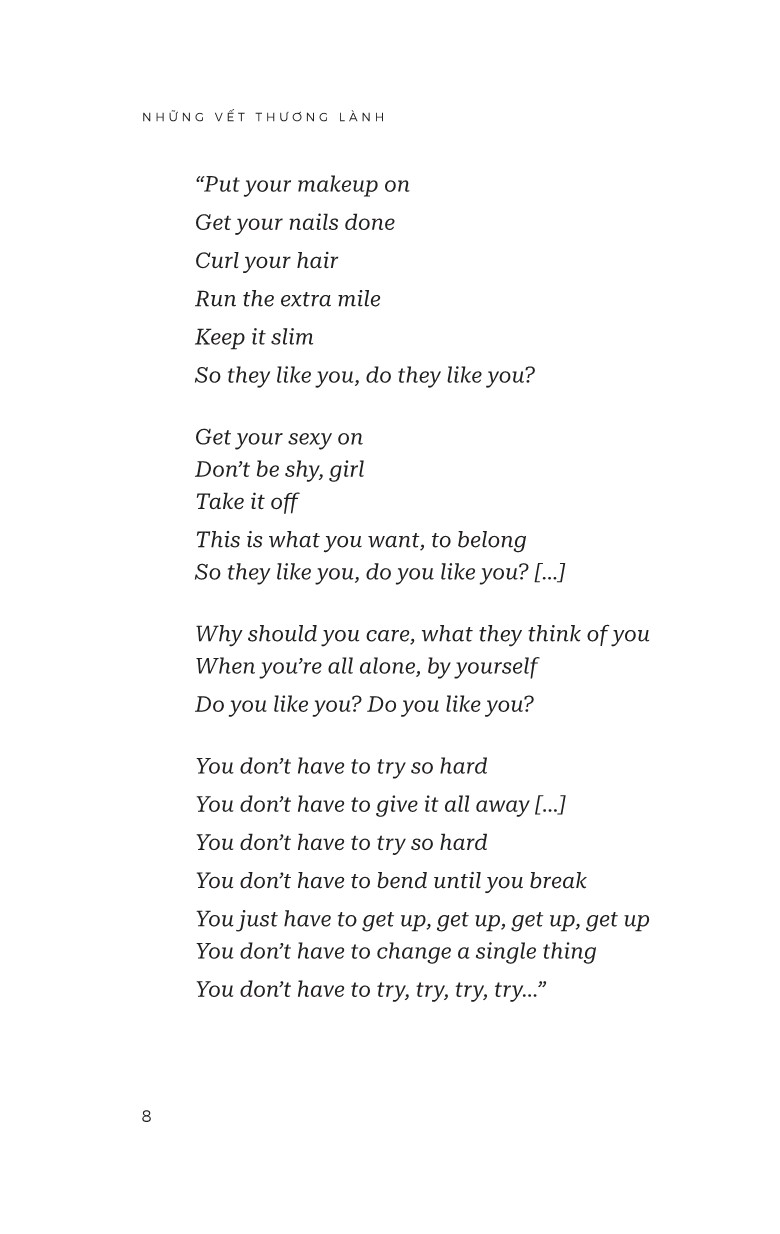 Đi qua nỗi đau không nhất thiết phải là lành lặn và không còn cảm thấy đau chút nào nữa. Những vết thương lành vẫn sẽ để lại sẹo, có những cơn đau vẫn âm ỉ những lúc trái gió trở trời. Nhưng chúng ta giờ đã khác - đã có thể yêu thương, thấu hiểu và ôm ấp tất cả. Cơn đau rồi cũng sẽ qua. Mọi thứ rồi sẽ ổn. Tôi tin là như thế.