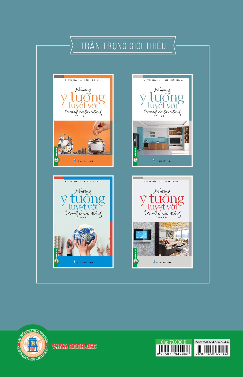 Bộ sách “Những ý tưởng tuyệt vời trong cuộc sống” gồm 4 tập. Mỗi tập là những suy nghĩ sáng tạo đa dạng khác nhau, và đặc biệt ứng dụng một cách dễ dàng trong thực tế cuộc sống. Tất cả những ý tưởng đó đều theo phương châm tiết kiệm, đơn giản, dễ làm, dễ nhớ, bổ ích hữu dụng nhưng vẫn luôn đa dạng, phong phú, hấp dẫn, đầy dinh dưỡng, tốt cho sức khỏe, giúp tiết kiệm thời gian và công sức, tận dụng phế thải bảo vệ môi trường, biến việc dọn dẹp-vệ sinh không còn là ác mộng…