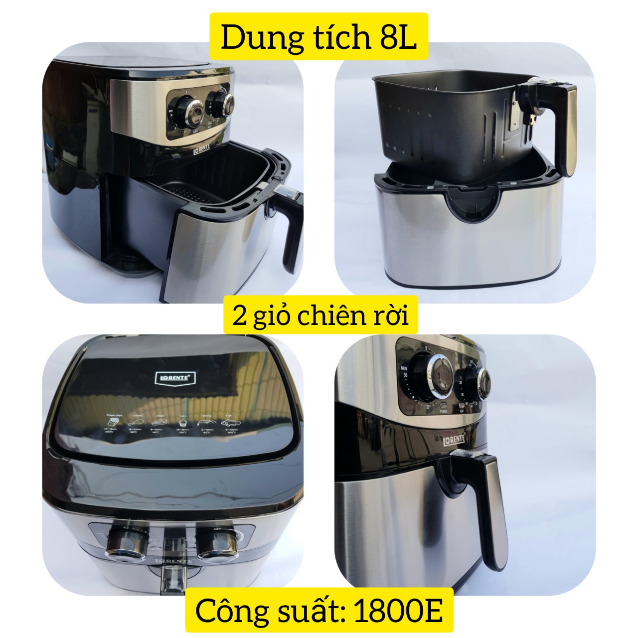 ✨Nồi Chiên Không Dầu Dung tích Lớn 8 Lít, Công suất 1800W, Giỏ Chiên Rời, Ốp Inox LORENTE LT-1619 - HÀNG CHÍNH HÃNG
