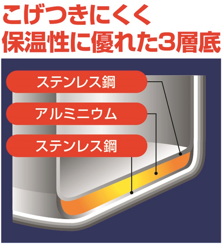 - Đáy nồi với cấu tạo bằng 3 lớp kép hợp kim nhôm/ thép không gỉ (16% chrome)