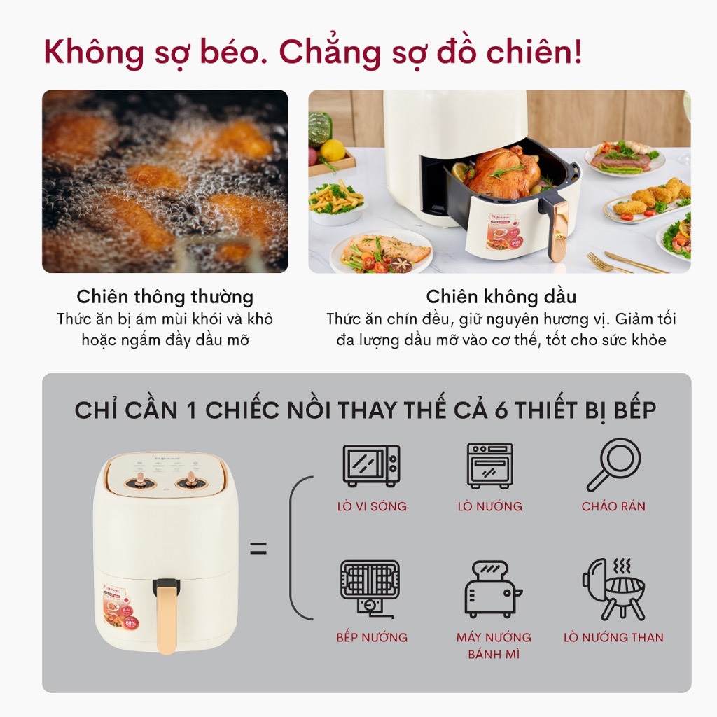 ✨Nồi chiên không dầu 6.5L nhập khẩu Nhật Bản Fujihome A6W tự ngắt an toàn chống dính cao cấp - hàng chính hãng