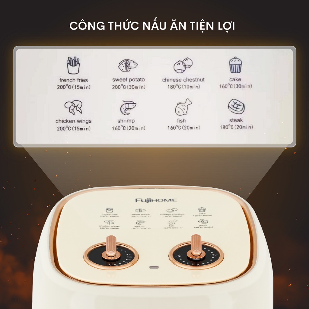NỒI CHIÊN KHÔNG DẦU FUJIHOME A5GG 5.5 LÍT >>> Chín bên trong - giòn bên ngoài nhờ công nghệ Rapid Air Loại bỏ 80% lượng chất béo trong thực phẩm <<< QÙA TẶNG :1 chiếc
