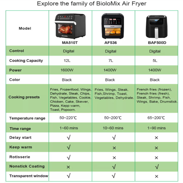 - Nồi chiên không khí Tất cả trong 1: Bạn có đang gặp rắc rối vì quá nhiều thứ bừa bộn trong nhà bếp? Đã đến lúc nói lời tạm biệt với nồi chiên nhúng nước, lò nướng bánh pizza, lò nướng bánh mì … Bất cứ điều gì họ có thể làm, lò nướng nồi chiên không khí BioloMix có thể làm tốt hơn! Thiết kế hai lớp độc đáo, tiết kiệm không gian và cho phép bạn chế biến nhiều loại thực phẩm cùng một lúc.