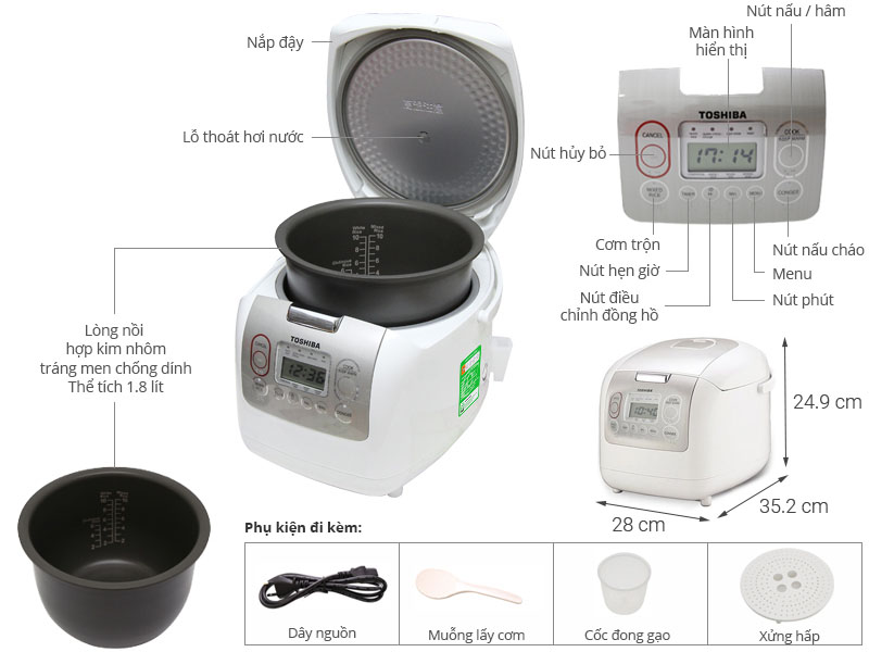 Nồi cơm điện tử Toshiba 1.8 lít RC-18NMFVN với các nút bấm có chú thích chức năng sử dụng rõ ràng giúp bạn điều chỉnh các chức năng, chế độ nấu dễ dàng, chính xác.