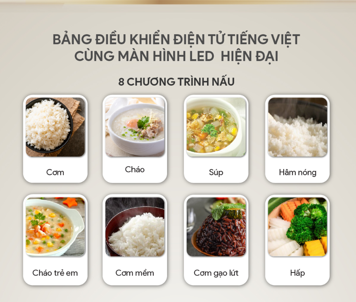 8 chế độ: Cơm, Cháo, Súp, Hâm nóng, Cháo trẻ em, Cơm mềm, Cơm gạo lứt, Hấp và 3 phím tắt nhanh gồm Cháo nhanh, Cơm, Cơm nhanh.