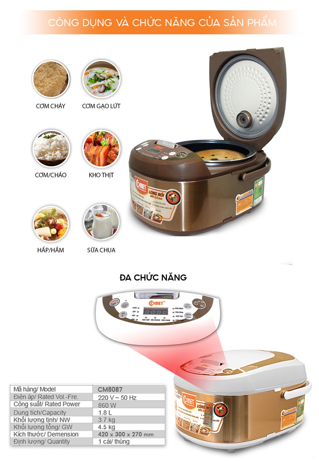 THÔNG TIN KỸ THUẬT: 1. Thương hiệu: Comet. 2. Sản phẩm: Nồi cơm điện tử. 3. Mã sản phẩm: CM8087. 4. Điện áp: 220V - 50Hz. 5. Công suất: 860W. 6. Dung tích: 1,8l. 7.