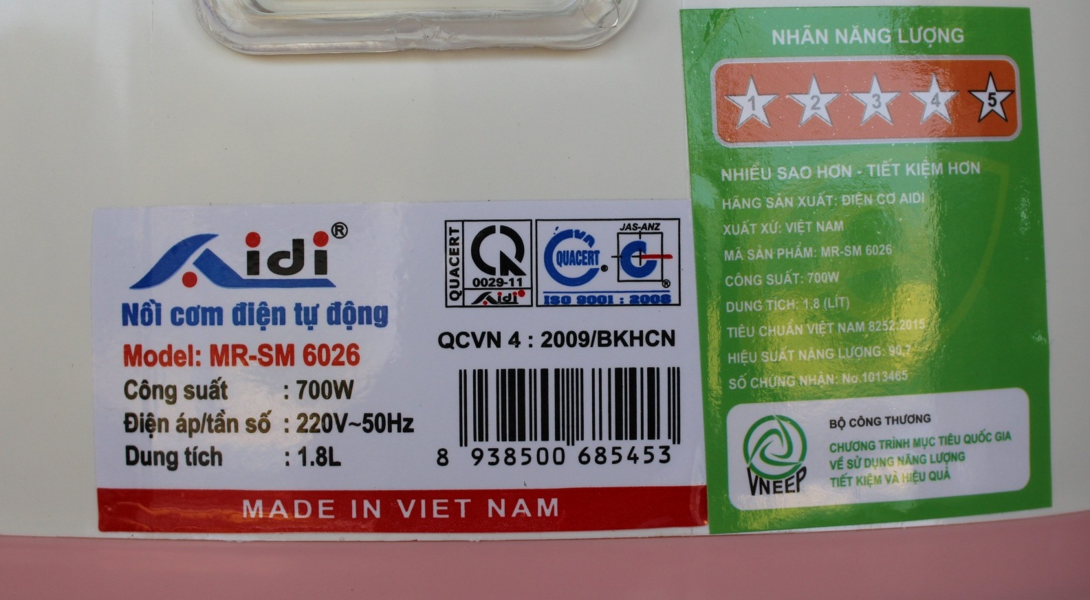Lưu Ý: Giao Màu Ngẫu Nhiên Tùy Đợt Hàng Nhập Model MR-SM 09K Tên hàng Nồi cơm điện Aidi Dung tích 1.8L Công suất khi đun 700W Công suất khi giữ ấm 40W Điện áp