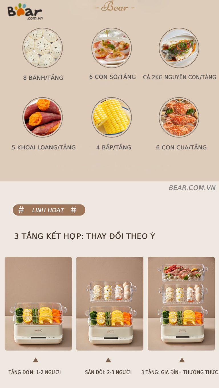 Mua tại TiktokTHÔNG TIN SẢN PHẨM: Thương hiệu: Bear Model: DZG-CA2G2 – Dung tích: 12L – Dung tích bình chứa nước: 1.3L – Công suất: 800W – Màu sắc: màu kem – Kích thước (3 tầng): 330250360mm – Tính năng: hấp bánh, ngũ cốc, hấp rau, sường, cá, hải sản, bảo quản, giữ nhiệ ƯU ĐIỂM – Ba tầng công suất lớn đảo theo ý muốn – Xả hơi nhanh chóng: Thu thập năng lượng để khóa sự tươi mát – 6 menu chính: Tốt cho ba bữa ăn – Hẹn lâu, không cần phải đợi đồ ăn lâu – Chế độ bảo quản nhiệt kép: Bảo quản nhiệt bằng tay/tự động – Khay đựng nước trái cây đặc biệt: Có thể tháo rời và dễ dàng vệ sinh