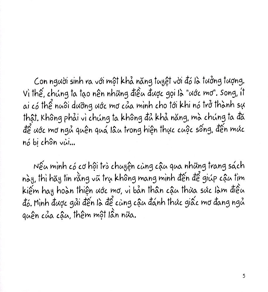 Nếu mình có được cơ hội trò chuyện cùng cậu qua những trang sách này thì hãy tin rằng vũ trụ không mang mình đến để giúp cậu tìm kiếm hay hoàn thiện ước mơ, vì bản thân cậu thừa sức làm được điều đó. Mình được gửi đến là để cùng cậu đánh thức giấc mơ đang ngủ quên của cậu, một lần nữa.