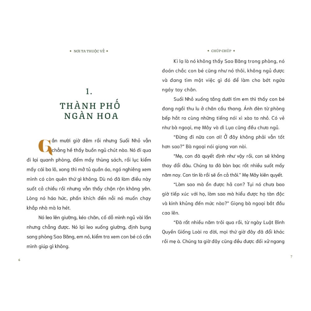 Nơi ta thuộc về được viết dưới góc nhìn của Suối Nhỏ, cậu bé loài người sống trong một thế giới nơi mà con người chịu sự phân biệt và định kiến vô cùng nặng nề từ muôn loài. Như một hành trình dài để trưởng thành, Suối Nhỏ đã cố gắng vượt qua định kiến xã hội, những nỗi sợ bên trong, để có thể trở nên dũng cảm, đối diện với những nghi ngại về bản thân, để thực sự tìm ra được mình là ai, mình muốn và cần làm gì trong cuộc đời.