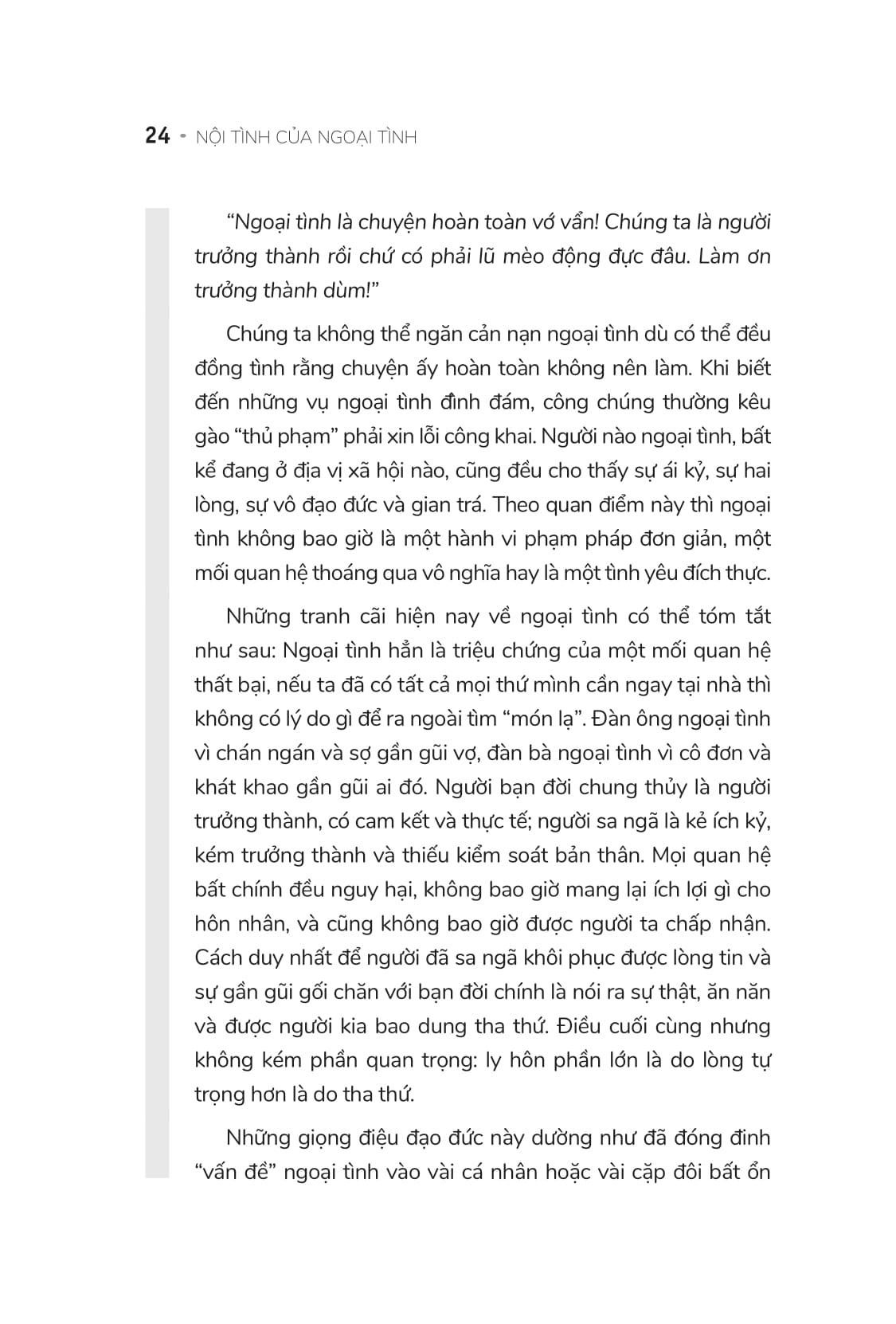 Ngày nay một cuộc đối thoại về các mối quan hệ bất chính dễ mang tính chia cắt, phán xét, và có lối suy nghĩ thiển cận. Xét dưới góc một nền văn hóa, chúng ta chưa khi nào cởi mở về tình dục hơn ngày nay, nhưng sự bội bạc vẫn còn chìm khuất đằng sau một đám mây của sự hổ thẹn và giấu giếm. Tôi hy vọng quyển sách này sẽ giúp xua đi sự im lặng ấy và mở ra một lối suy nghĩ và diễn đạt mới mẻ cho một trong những điều xưa cổ nhất trong cuộc sống của con người. Rất nhiều người đã viết ra cách ngăn ngừa và chữa lành sau khi sự đã xảy ra; nhưng ít ai viết về ý nghĩa và động cơ của các mối quan hệ bất chính. Càng ít hơn nữa những người nói về những điều mà chúng ta có thể học được từ các mối quan hệ và làm thế nào để kiến thức ấy có thể biến đổi và hoàn thiện các mối quan hệ của chúng ta.