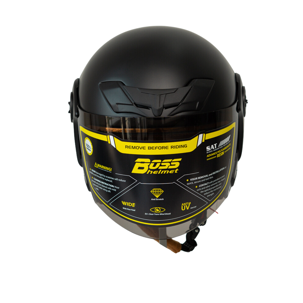 Nón Bảo Hiểm 3/4 Có Kính Moto BOSS AT22.1 Đa Dạng Màu Sắc  THÔNG TIN CHI TIẾT Thương hiệu: BOSS HELMET Kích thước nón: 1 Size (phù hợp chu vi vòng đầu: 55-60cm) Cân nặng: 950±50gr Màu sắc: Đen Mờ, Nâu Socola Mờ. Kiểu mũ bảo hiểm: Mô tô/ Xe máy/ Mũ bảo hiểm & Phụ kiện Kiểu nón: Nón bảo hiểm che 3/4 đầu và tai,  có kính chắn gió (dùng cho ánh sáng ban ngày) Loại bảo hành: Bảo hành nhà sản xuất 24 tháng Chất liệu: Nhựa ABS, Xốp EPS, Dây quai PP, Khóa Acetic Tên tổ chức chịu trách nhiệm bảo hành: An Tran Helmet MÔ TẢ SẢN PHẨM Nón Bảo Hiểm 3/4 Có Kính Moto BOSS AT22.1 được đánh giá là dòng nón bảo hiểm mang tính thể thao tập hợp đầy đủ các tính năng nổi trội: góc cạnh sắc xảo, các khe thông gió được thiết kế phù hợp với kiểu dáng cũng như duy trì được độ ổn định khi chạy xe ở tốc độ cao.   Vỏ nón được làm từ nguyên liệu nhựa nguyên sinh ABS – đặc tính cứng rắn nhưng không giòn , loại
