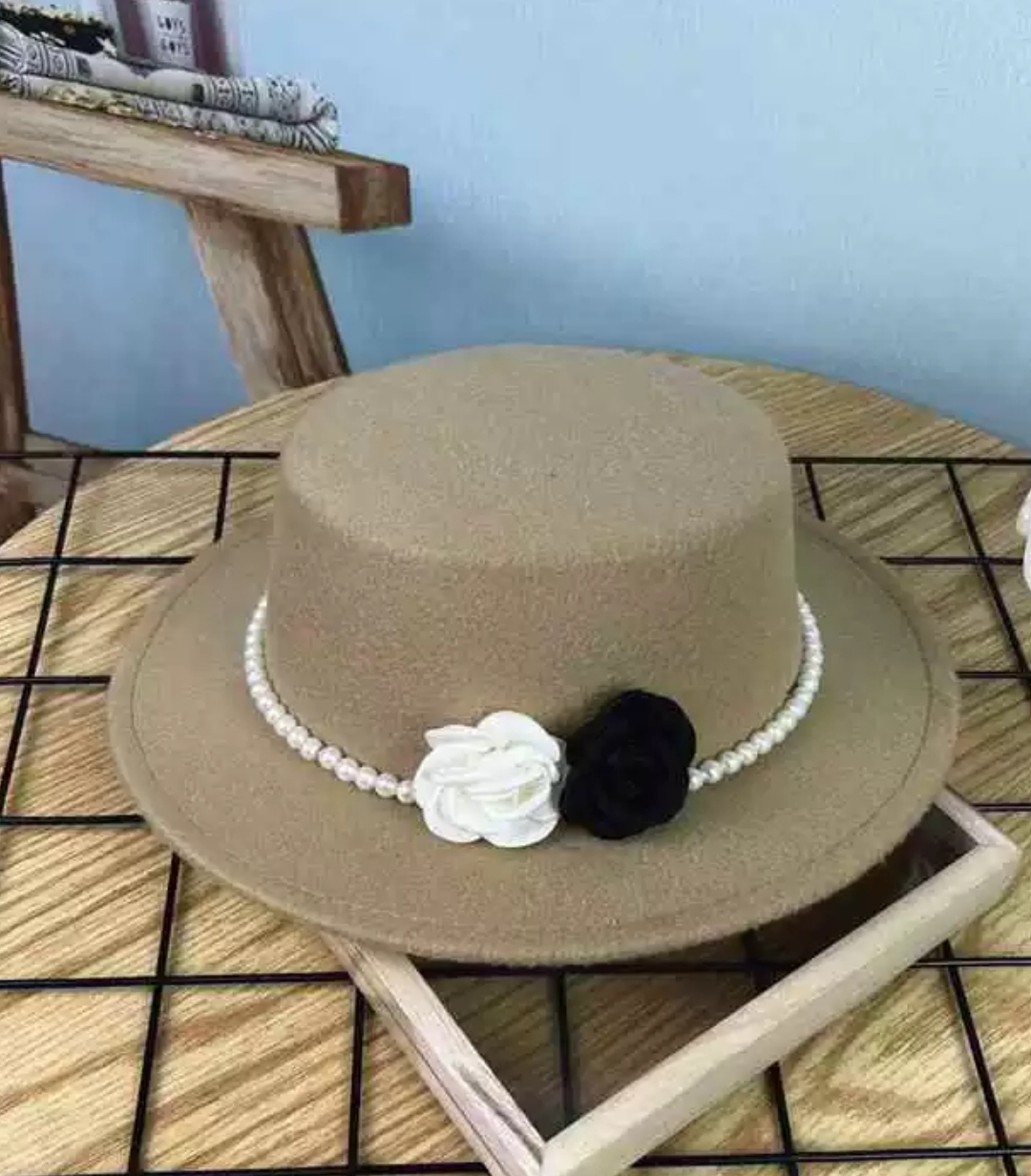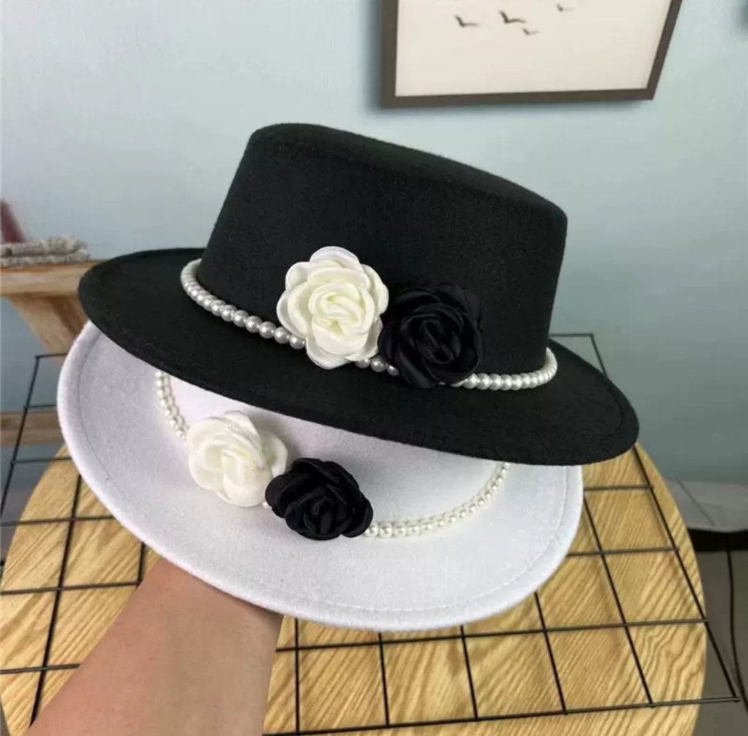 Nón cao bồi vành bằng mũ rộng vành nỉ dạ phối 2 hoa đen trắng đai ngọc trai nhân tạo thời trang Hàn Quốc Nón đi biển mũ vành nhỏ thoáng mát thời trang du