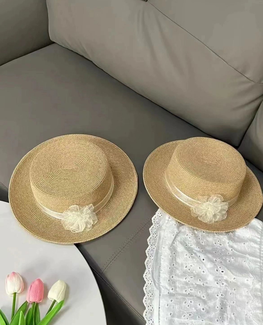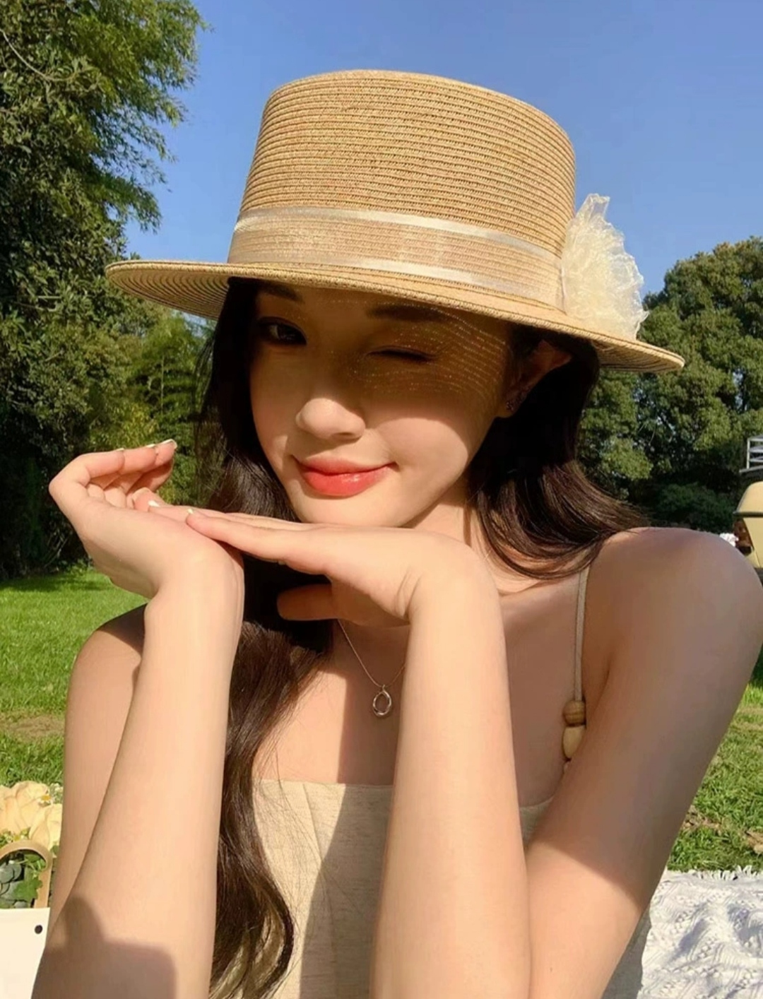 Mũ cói rơm vành phẳng nữ mùa hè phiên bản Hàn Quốc chống nắng UV cho kỳ nghỉ Nón đi biển Paris thời trang hàng đầu Pháp Chất liệu cói
