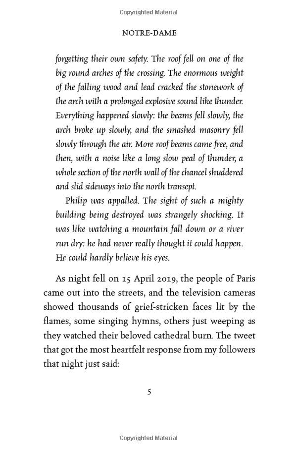 ‘Two days after Notre Dame burned, I flew to Paris to appear on the TV programme La Grande Librairie for a discussion about cathedrals. The following morning I had breakfast at the Hotel Bristol with my French publisher and she asked me to write a short book about Notre Dame and what it means to all of us. She said she would donate the publisher’s profits to the rebuilding fund and, if I wished, I could do the same with my royalties. Yes, I said; of course, I’d love to.’