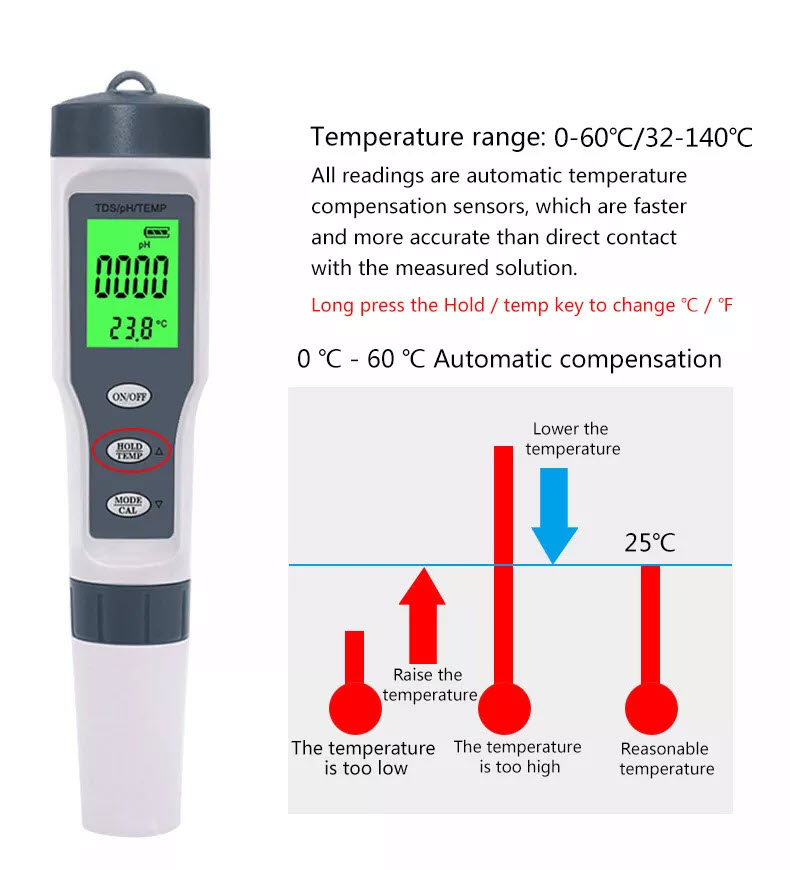 【Automatic Temperature Compensation Sensors】 All the temperature readings are automatic temperature compensation sensors, which are faster and more accurate than direct contact with the measured solution, and long press the HOLD/TEMPE key to convert ℃/℉.