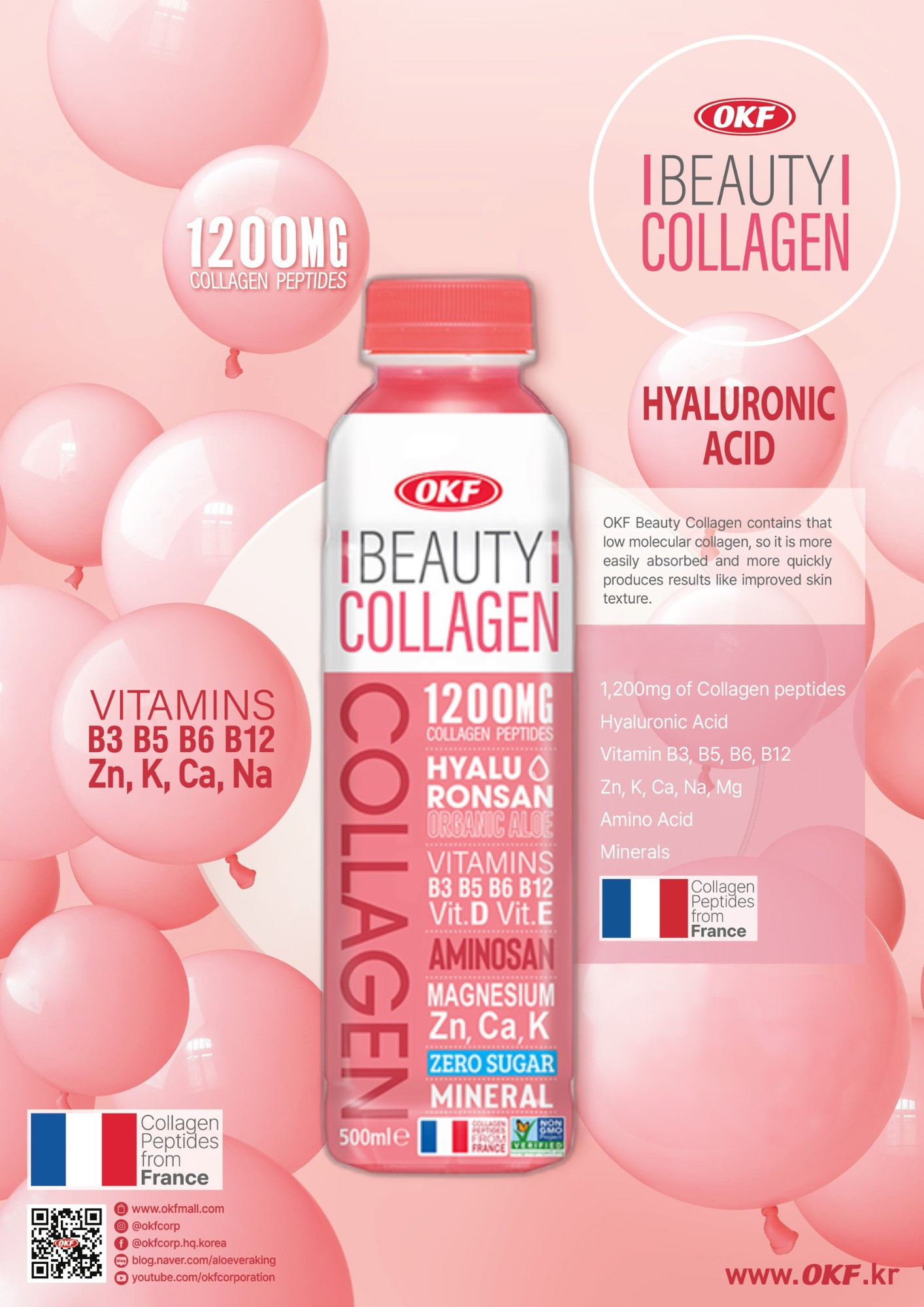- OKF Beauty Collagen chứa loại collagen có phân tử thấp nên dễ hấp thụ hơn và nhanh chóng mang lại kết quả như cải thiện kết cấu da.
