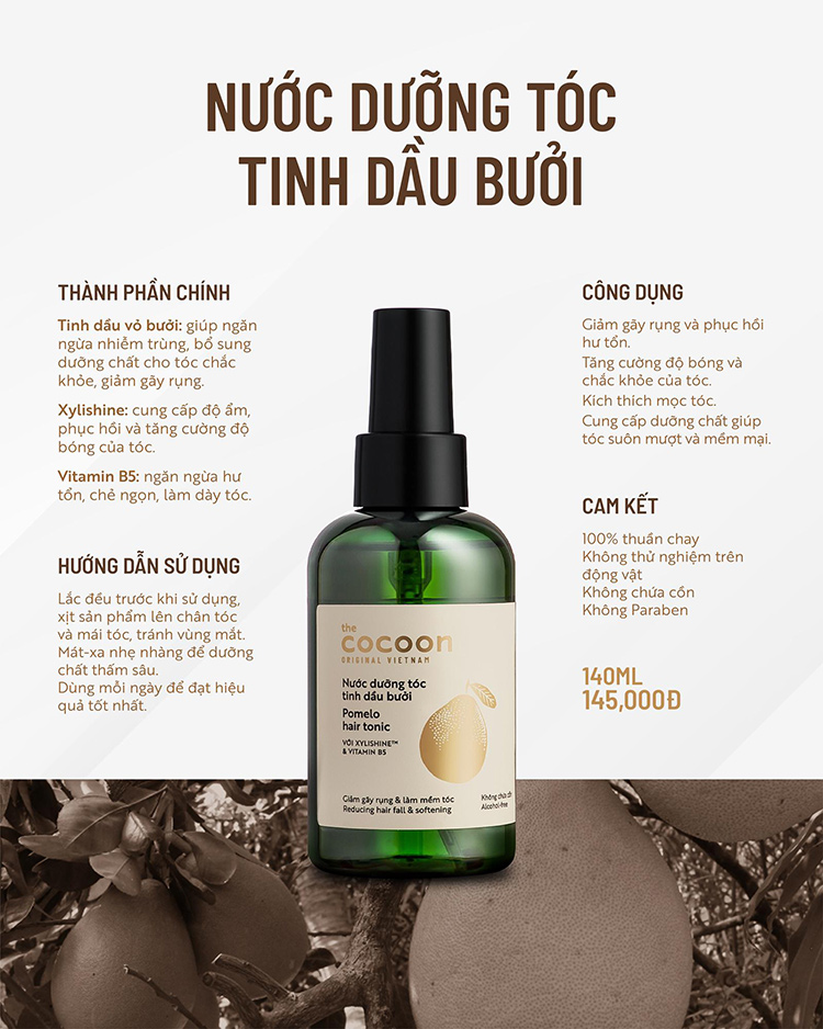 Nước Dưỡng Tóc Cocoon Tinh Dầu Bưởi Pomelo Hair Tonic 140ml Nước Dưỡng Tóc Cocoon Tinh Dầu Bưởi Pomelo Hair Tonic 140ml phiên bản nâng cấp là sản phẩm dành cho tóc, phù hợp với