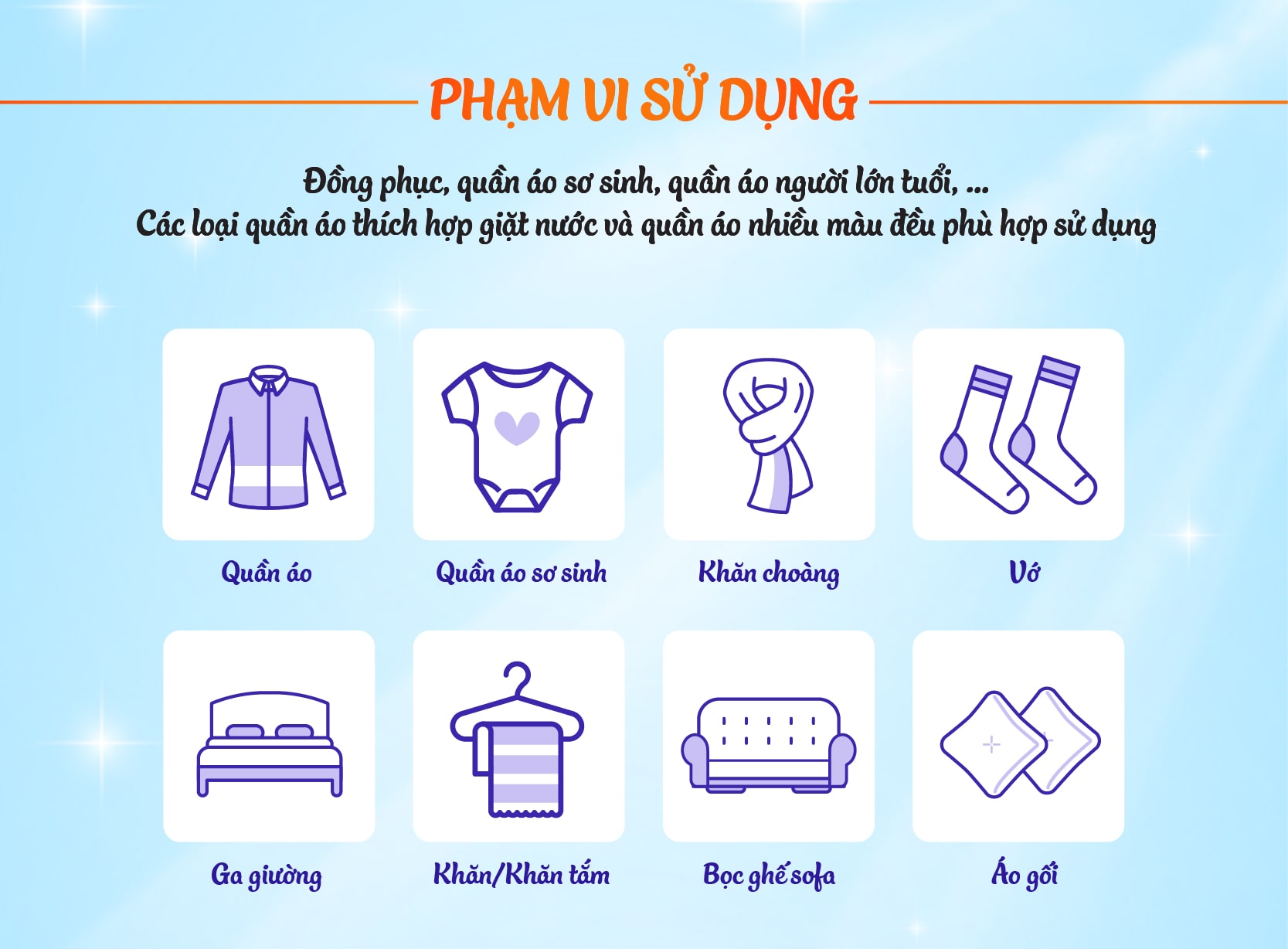 Mềm mại vớí da tay.Thích hợp giặt đồ dùng cho da nhậy cảm,kể cả da em bé Loại bỏ mùi ẩm mốc trên quần áo,các vết dơ,mùi mồ hôi,mùi khói Bảo vệ màu và chất
