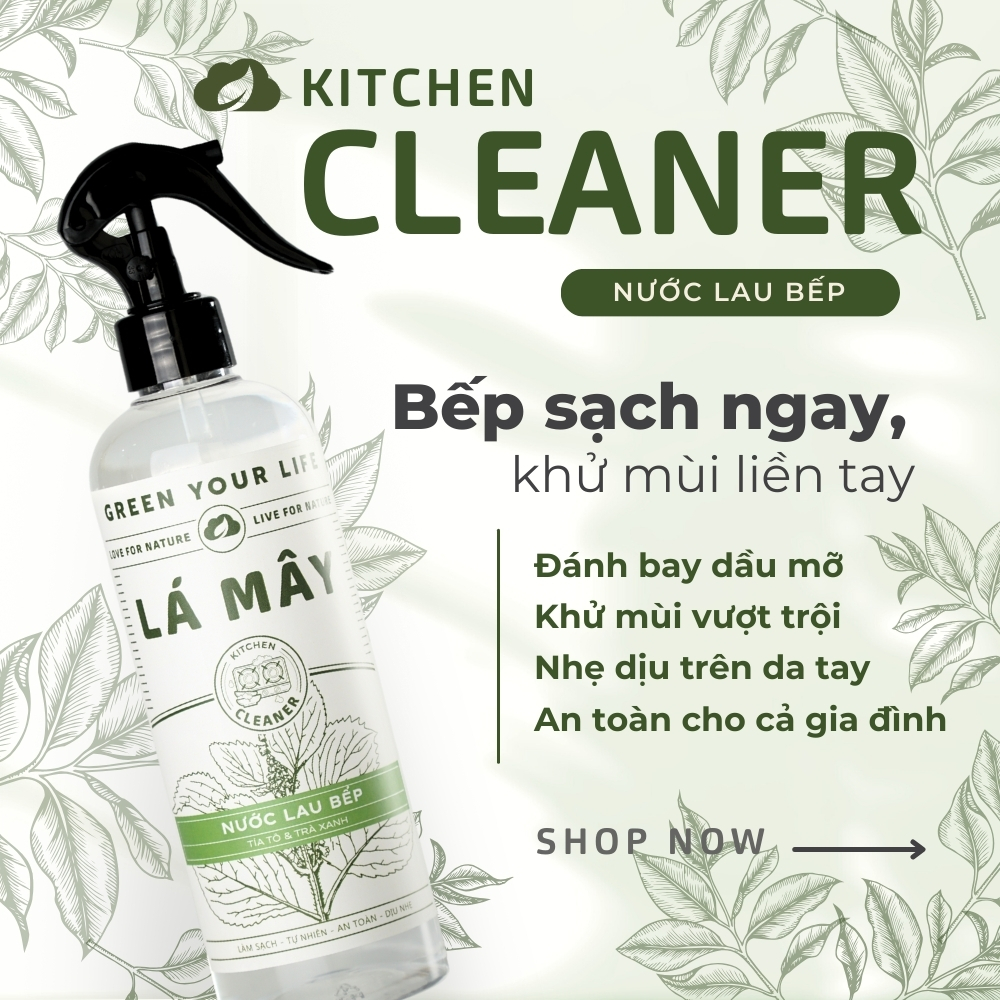 - Nước lau bếp Lá Mây được làm từ các thành phần phân hủy sinh học, giúp bạn làm sạch gian bếp mà không gây hại cho môi trường.