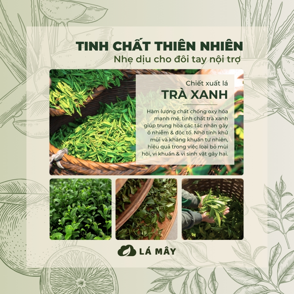 - Chiết xuất từ các tinh chất thiên nhiên từ lá tía tô & lá trà xanh, nước lau bếp Lá Mây giúp làm sạch bếp hiệu quả mà không để lại hóa chất độc hại.