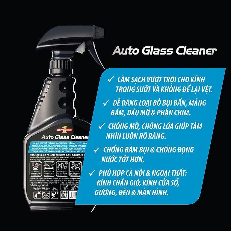• Một số chất tẩy rửa kính gia dụng có chứa amoniac, có thể làm hỏng bề mặt kính ô tô. Sử dụng nước lau kính Super One Auto Glass Cleaner được thiết kế dành riêng cho ô tô của bạn và loại bỏ những vết bẩn cứng đầu nhất mà không làm hỏng bề mặt kính xe.