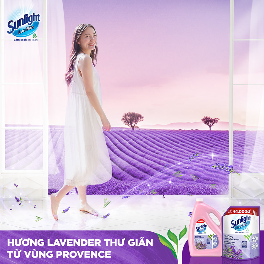SUNLIGHT NƯỚC LAU SÀN TINH DẦU THẢO MỘC - HƯƠNG HOA LAVENDER - CHO SÀN SẠCH THƠM TINH TẾ Nước lau sàn Sunlight hương hoa Lavender mới, với tinh dầu Lavender 100% và mùi hương thư thái lấy cảm hứng từ những cánh đồng hoa Lavender vùng Provence nước Pháp, giúp thanh lọc không gian sống, mang lại tổ ấm trong lành và ngát hương thơm thư thái dễ chịu. Hương hoa Lavender là mùi hương đang "sốt" được yêu thích ở rất nhiều sản phẩm, nay đã có ở nước lau sàn Sunlight. ƯU ĐIỂM NỔI BẬT: