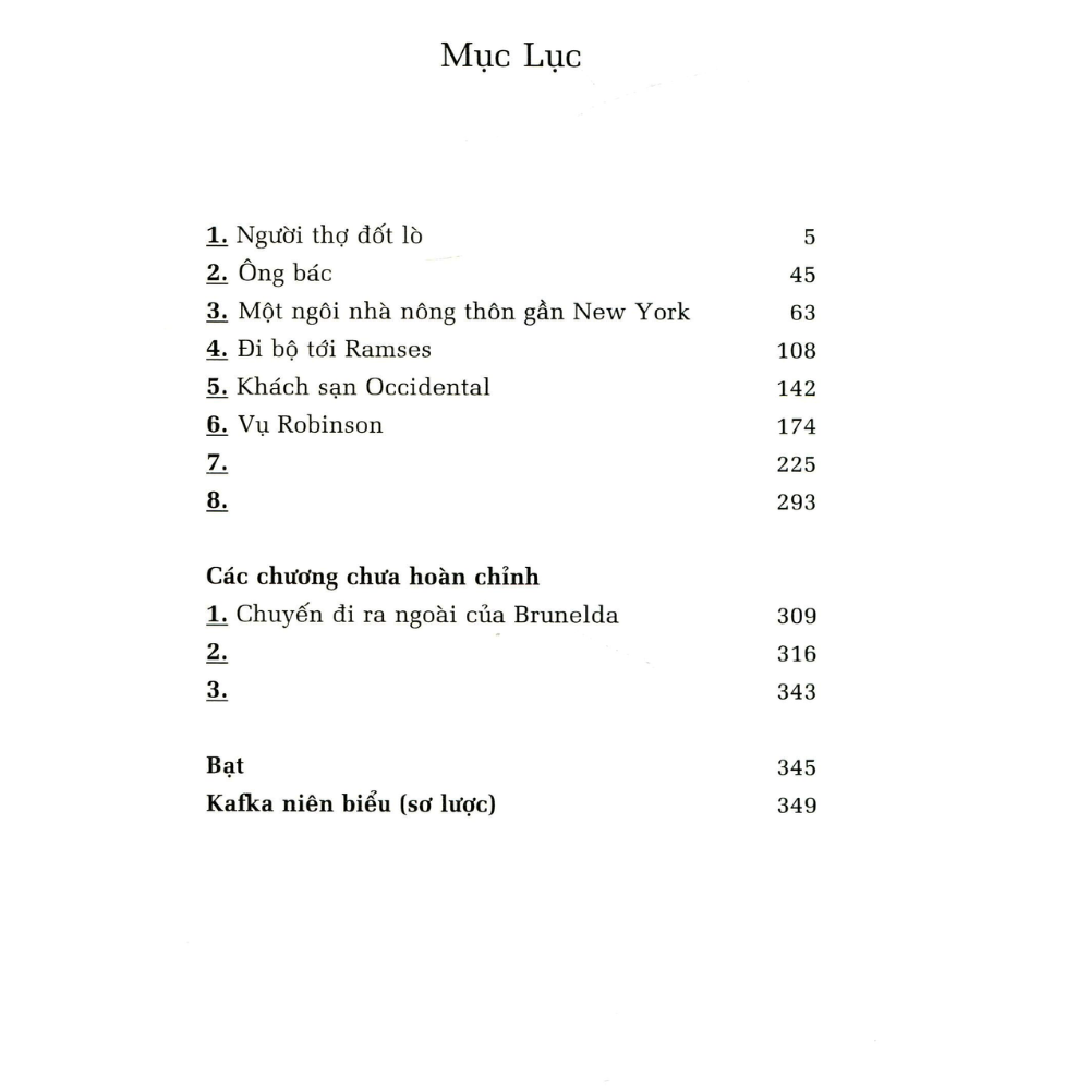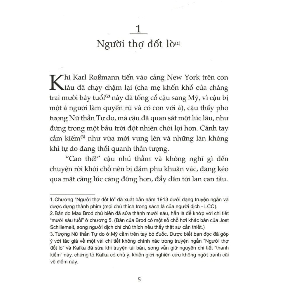 Cập cảng New York trên một con tàu lớn khủng khiếp, Karl Roßmann, kẻ tội đồ từng gây tội lỗi tình ái ở quê hương được chào đón bởi Nữ thần Tự do giương cao thanh kiếm giữa bầu trời lồng lộng. Cảnh tượng bỗng đột nhiên trở nên chói lọi. Từ đây, Karl rơi thẳng vào vòng xoáy rủi may may rủi đến chóng mặt. Karl đã trải nghiệm cuộc sống lên voi xuống chó khôn lường dở cười dở khóc nơi miền đất của những cơ hội thần kỳ. Và tương lai của cậu là gì? Điều đó không ai biết, bởi vì tiểu thuyết đã dừng bước ngay khi chuyến tàu đưa nhân vật chính đến vùng đất có cái tên hư hư thực thực – Oklahama – chỉ vừa mới khởi hành...