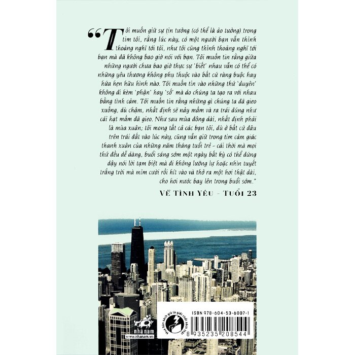 “Tôi muốn giữ sự tin tưởng (có thể là ảo tưởng) trong tim tôi, rằng lúc này, có một người bạn vẫn thỉnh thoảng nghĩ tới tôi, như tôi cũng thỉnh thoảng nghĩ tới bạn mà đã không bao giờ nói với bạn. Tôi muốn tin rằng giữa những người chưa bao giờ thực sự ‘biết’ nhau vẫn có thể có những yêu thương không phụ thuộc vào bất cứ ràng buộc hay hứa hẹn hữu hình nào. Tôi muốn tin vào những thứ ‘duyên’ không đi kèm ‘phận’ hay ‘số’ mà do chúng ta tạo ra với nhau bằng tình cảm. Tôi muốn tin rằng những gì chúng ta đã gieo xuống, dù chậm, nhất định sẽ nảy mầm và ra trái đúng như cái hạt mầm đã gieo. Như sau mùa đông dài, nhất định phải là mùa xuân; tôi mong tất cả các bạn tôi, dù ở bất cứ đâu trên trái đất vào lúc này, cũng vẫn giữ trong tim cảm giác thanh xuân của những năm tháng tuổi trẻ - cái thời mà mọi thứ đều dễ dàng, buổi sáng sớm một ngày bất kỳ có thể đứng dậy nói lời tạm biệt mà đi không lưỡng lự hoặc nhìn tuyết trắng trời mà mỉm cười rồi hít vào và thở ra một hơi thật dài, cho hơi nước bay lên trong buổi sớm.”