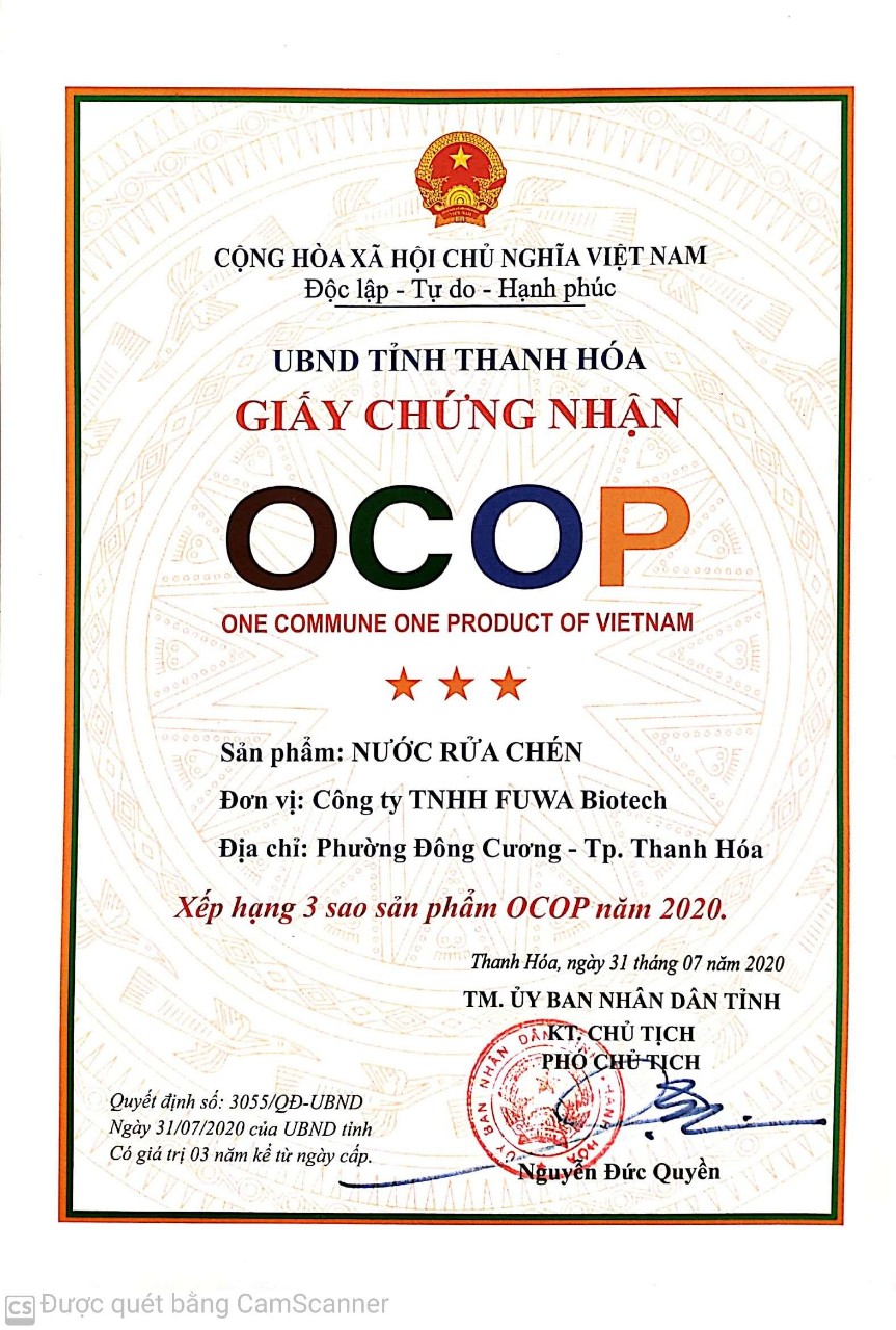 Nước rửa chén Fuwa3e với công nghệ enzyme sinh học lên men từ dứa và bồ hòn, tẩy rửa dầu mỡ hiệu quả và khử mùi tốt nhờ cơ chế xúc tác sinh học. Sản phẩm không chất tẩy hóa học đã được kiểm định không kích ứng da bởi Quatest 2 và chứng nhận khử khuẩn bởi Viện Pasteur. Một đặc điểm nổi bật của sản phẩm là nước thải sau rửa chén có thể dùng trực tiếp để tưới cây, các enzyme trong nước thải sẽ làm sạch đất và cung cấp thêm lợi khuẩn.