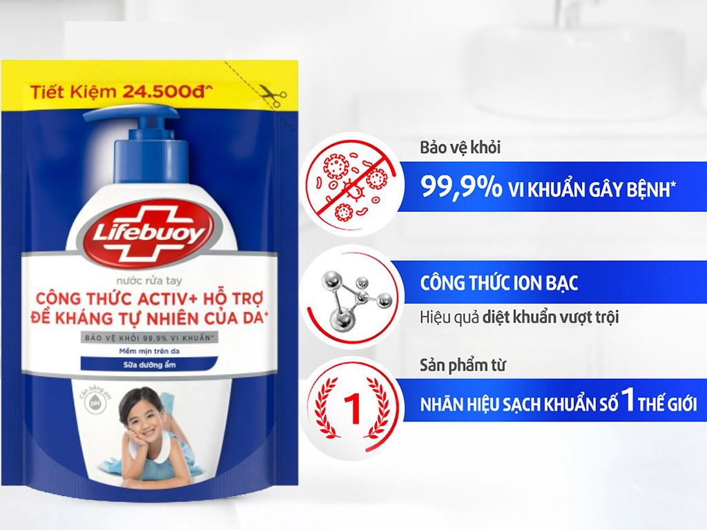 BAO BÌ THAY ĐỔI THEO TỪNG ĐỢT NHẬP HÀNG  NƯỚC RỬA TAY CHĂM SÓC DA   Trong sinh hoạt hàng ngày, tay luôn là nơi tiếp xúc với rất nhiều vi khuẩn nếu không rửa tay thường xuyên để sạch khuẩn thì rất có khả năng cao sẽ ảnh hưỡng đến sức khoẻ bản thân. Với dòng sản phẩm nước rửa tay Chăm Sóc Da có khả năng làm sạch đến 99,9% vi khuẩn cùng tinh chất sữa sẽ da tay bạn và cả gia đình luôn được sạch sẽ và mịn màng, tránh được các vấn đề sức khoẻ do vi khuẩn gây ra và ngăn ngừa vi khuẩn lây lan ra cộng đồng.    ƯU ĐIỂM NỔI BẬT:  + Nước rửa tay chứ ion Bạc+ cùng đề kháng da bảo vệ giúp bảo vệ vượt trội và làm sạch đến 99,9% vi khuẩn gây bệnh và ngăn ngừa vi khuẩn lay lan trên da  + Hương chanh tự nhiên giúp khử mùi hôi tanh trên tay khi vào bếp  + Dòng sản phẩm Lifebuoy giúp bảo vệ khỏi 99.9% vi khuẩn  + Công thức chứa ion Bạc+ cùng tinh chất sữa giúp duy trì độ ẩm và mềm mại trên da tay  + Thành phần sạch khuẩn tiên tiến Active5 Activ+ giúp bảo vệ khỏi vi khuẩn