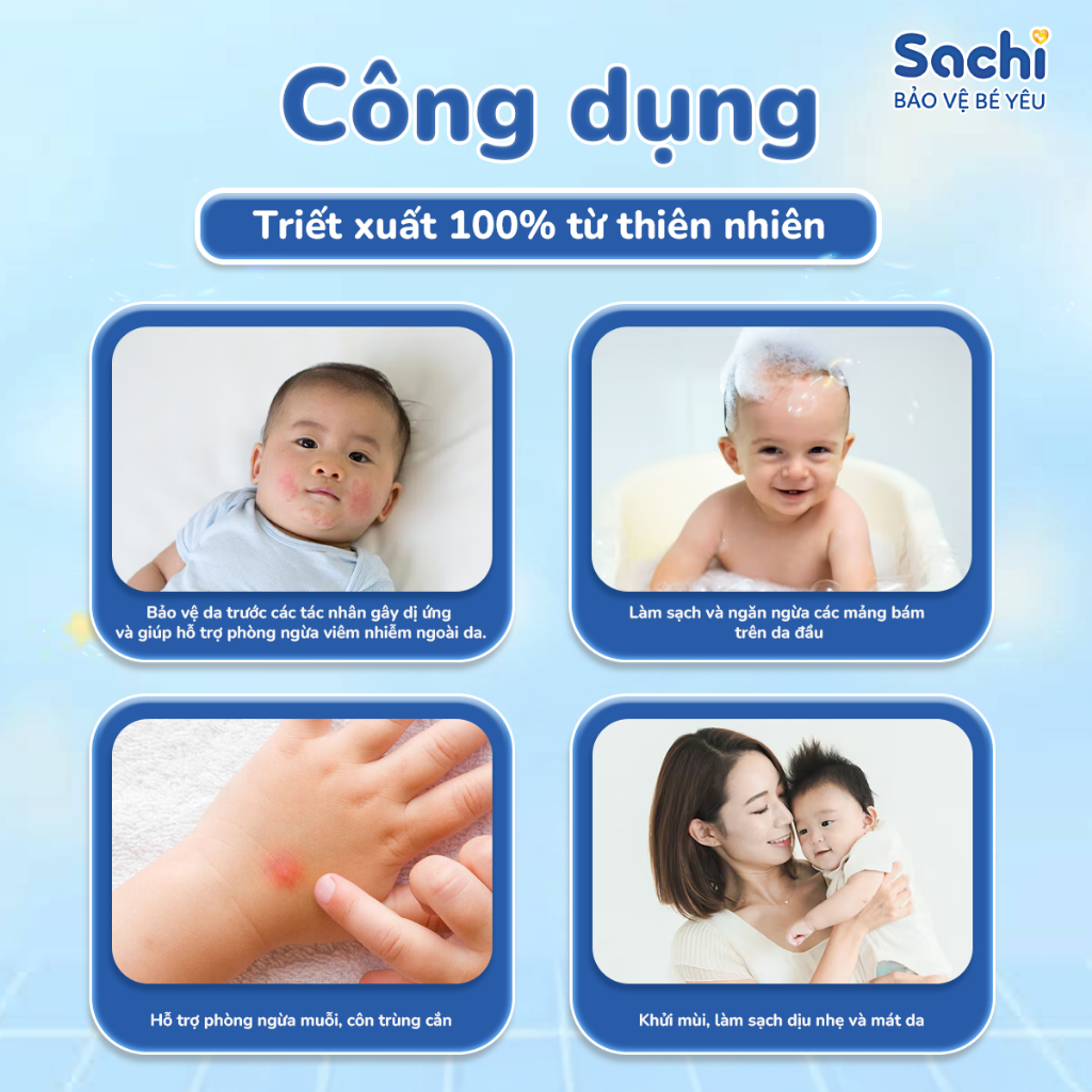 - Bảo vệ da trước các tác nhân gây dị ứng và giúp hỗ trợ trong việc phòng một số trường hợp viêm nhiễm ngoài da ở trẻ sơ sinh và trẻ nhỏ như hăm da, mụn nhọt, mẩn ngứa, rôm sảy, mề đay...cho làn da trông sáng sạch, khỏe mạnh hơn.