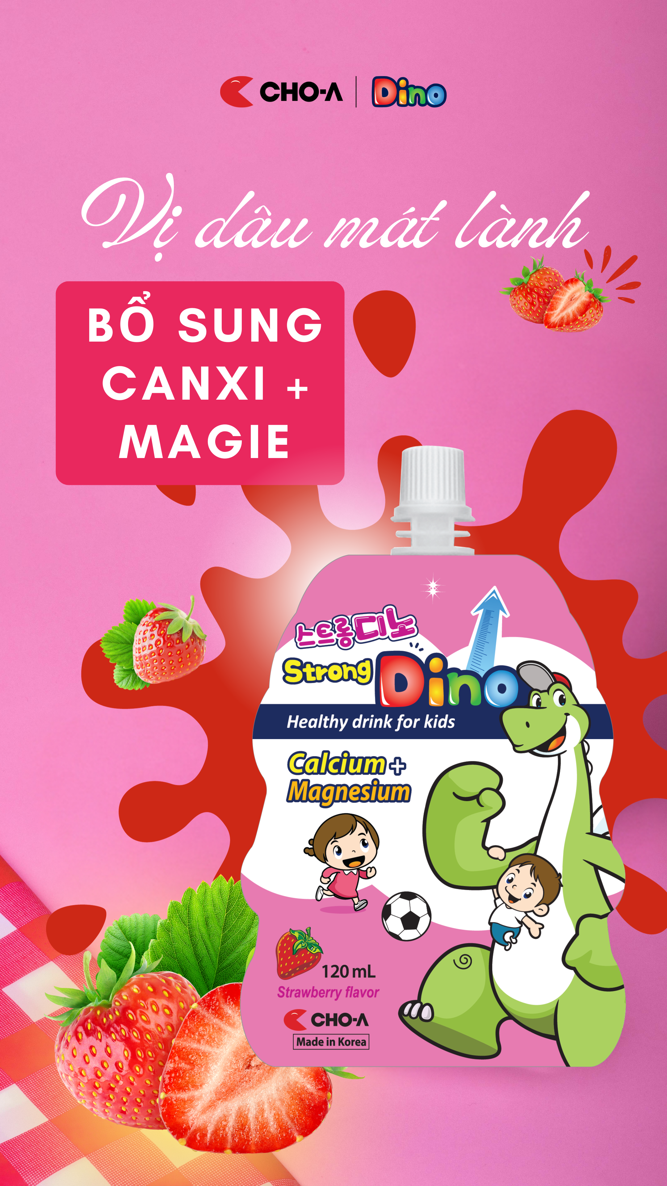 Nước Uống Dinh Dưỡng Vị Dâu Dành Cho Trẻ Em Strong Dino (10 Gói x 120ml) Nước uống dinh dưỡng Dino là sự lựa chọn hoàn hảo dành cho trẻ em trên 3 tuổi, là giải pháp tuyệt vời để hạn chế trẻ sử dụng các loại nước có gas. Sản phẩm được sản xuất bởi dây chuyền công nghệ hiện đại đạt chuẩn HACCP và GMP, được đảm bảo chất lượng dưới sự kiểm tra nghiêm ngặt của công ty CHO-A PHARM Hàn Quốc. Công Dụng: