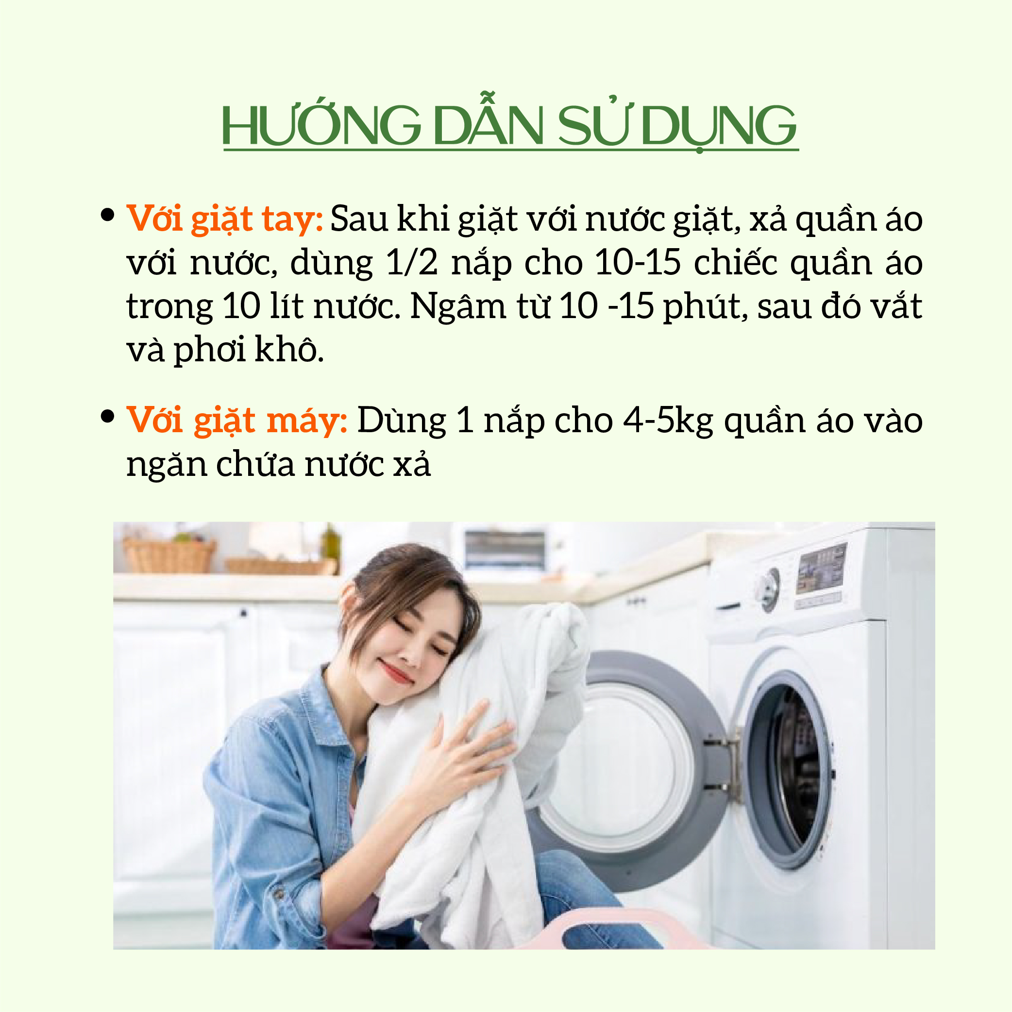 - Với giặt tay: Sau khi giặt với nước giặt, xả quần áo với nước, dùng 1/2 nắp cho 10-15 chiếc quần áo trong 10 lít nước. Ngâm từ 10 -15 phút, sau đó vắt và phơi khô.