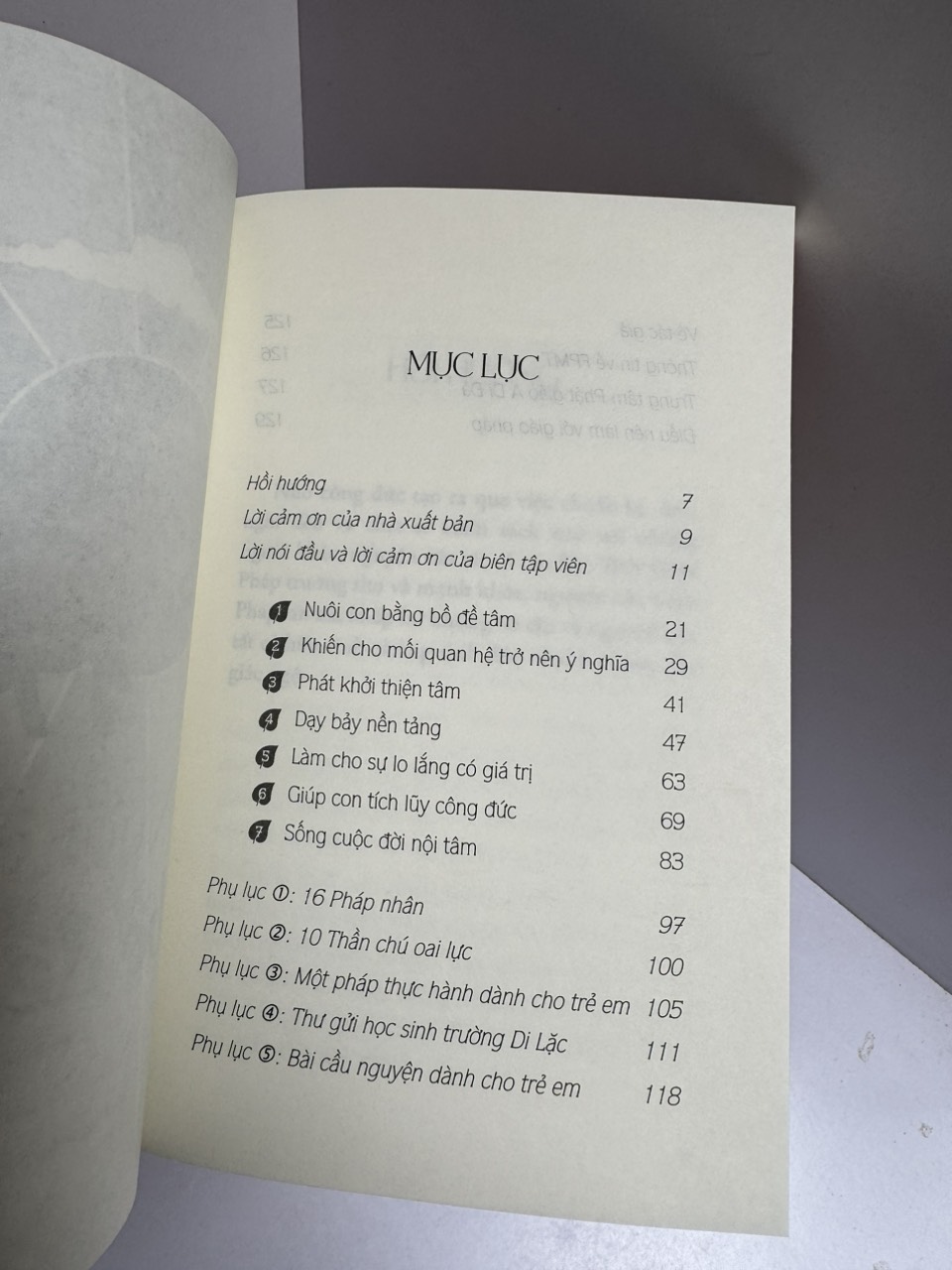 Tác giả cũng giảng giải chính xác cách cha mẹ nên tiếp tục làm việc này – thông qua dạy con phát khởi thiện tâm và tạo ra Bảy nền tảng cho Hạnh phúc và Bình an (từ ái, tùy hỷ, kham nhẫn, tha thứ, hối lỗi, hài lòng và dũng cảm) cũng như thông qua hướng dẫn con những thiện hạnh khi con còn nhỏ.