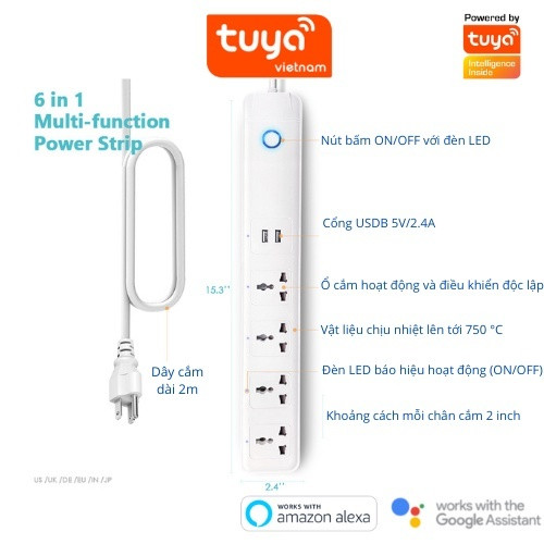 - Sản phẩm thiết kế có mạch chống xung điện áp cao, xung sét, bảo vệ các thiết bị điện, điện tử cao cấp như dàn âm thanh, tivi, lò nướng,... khỏi hư hỏng -Kết nối không dây wifi, cho phép người dùng điều khiển từ xa, bật tắt ngay trên các thiết bị di động ở bất kỳ đâu khi có kết nối Internet thông qua ứng dụng Smart Life của hệ sinh thái Tuya. Hoặc có thể điều khiển bằng giọng nói qua Google Assistant hay Amazon Alexa