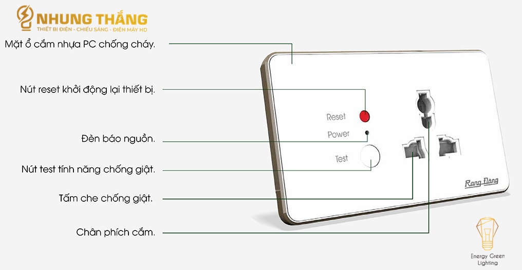 - Bảo vệ an toàn chống xung điện áp cao, xung sét. - Công tắc tích hợp rơ le chống quá tải 15A. - Ổ cắm đa năng sử dụng đồng chuyên dụng siêu đàn