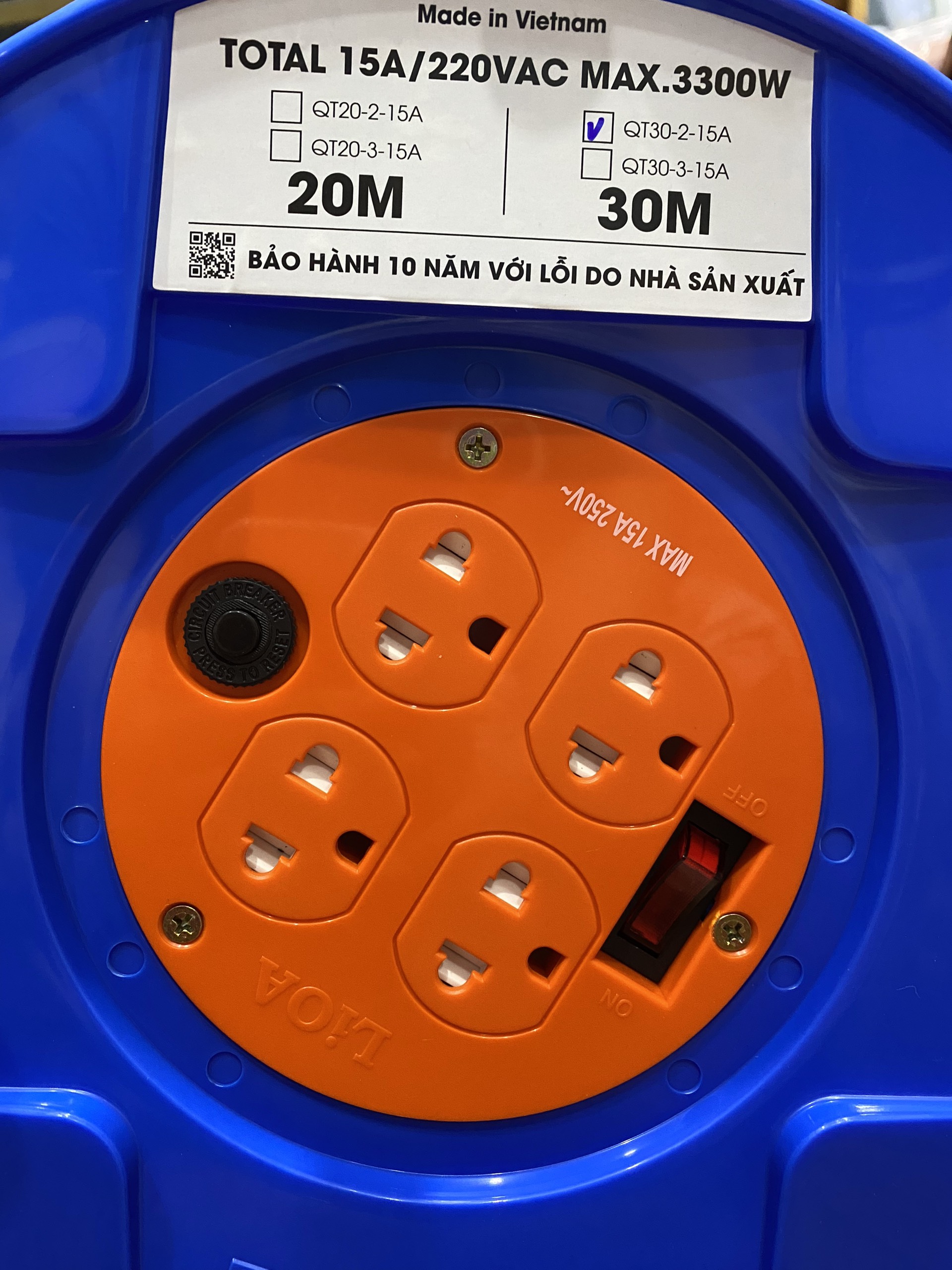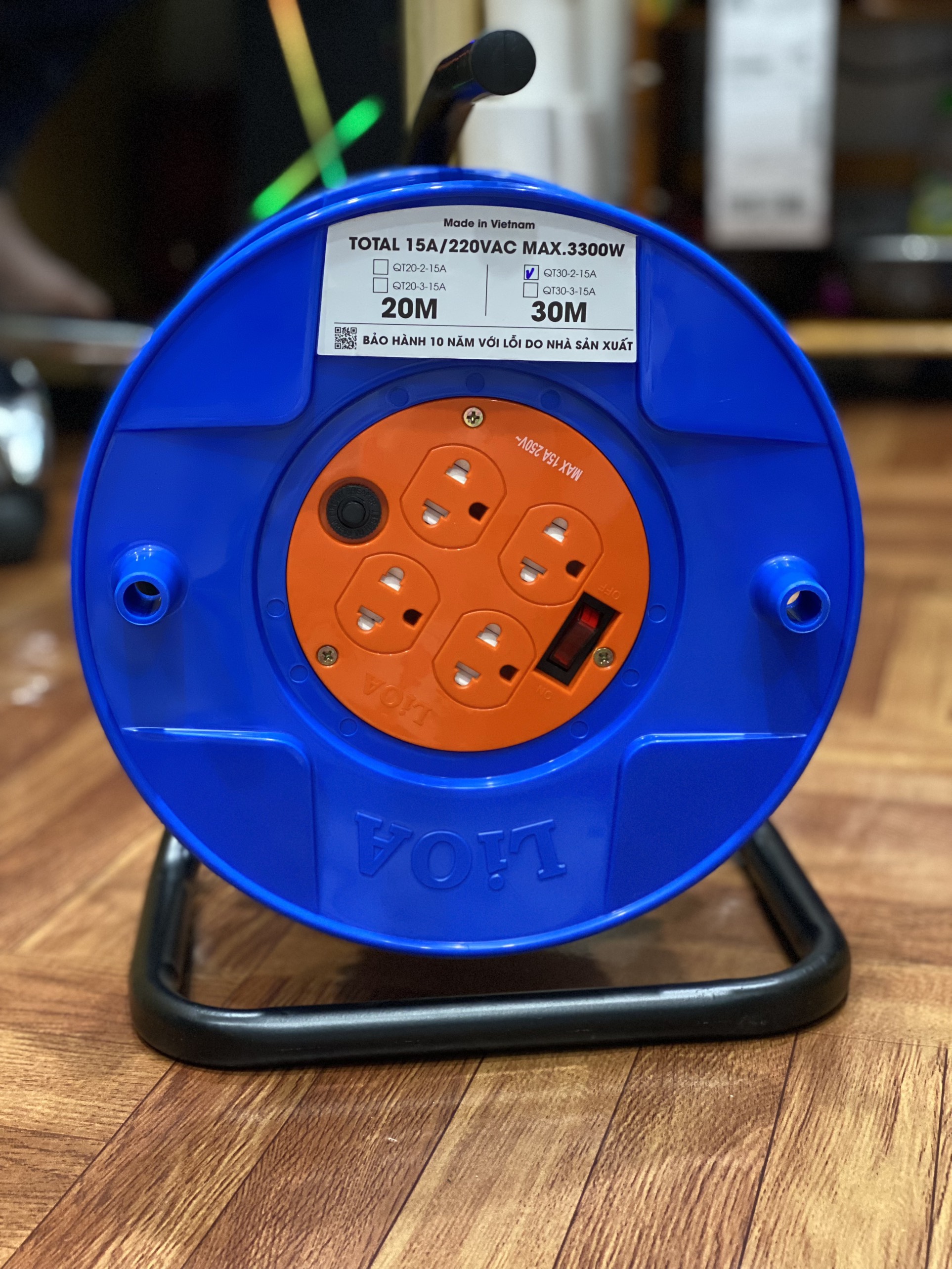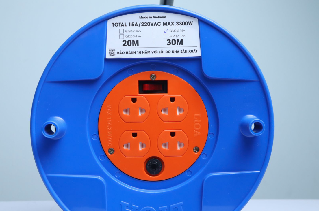 - Ổ cắm kéo dài quay tay kiểu Rulo to LiOA QT30-2-15A 30m x 2 15A có thể dùng được cho các thiết bị như: quạt, tivi, tủ lạnh, nồi cơm điện, đầu đĩa, âm ly, bếp từ, bàn ủi, máy hút bụi... hay những nơi có nhu cầu sử dụng ổ cắm dây dài. Thông số kỹ thuật:
