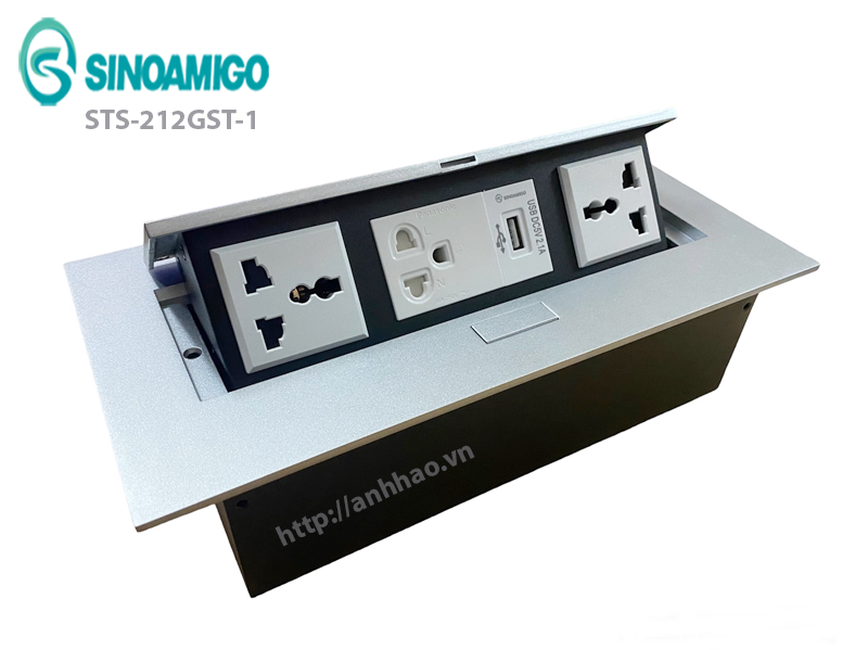 Ổ cắm điện âm bàn Sinoamigo STS-212GST-1 màu bạc. Tích hợp 3 ổ điện, 1 ổ sạc USB 5V-2.1A