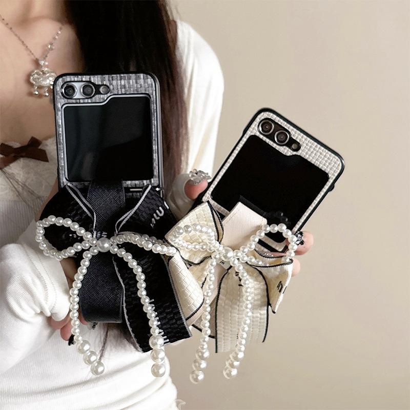 ✨Ốp Lưng Cho Samsung Galaxy Z FLip 6 / Z Flip 5 / Z Flip 4 Smile Đính Đá Nơ To Bản Kèm Dây Ngọc Trai Cầm Tay Xinh Xắn