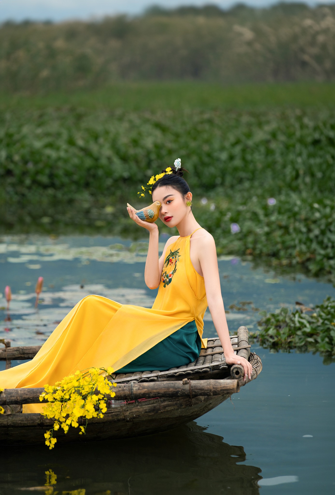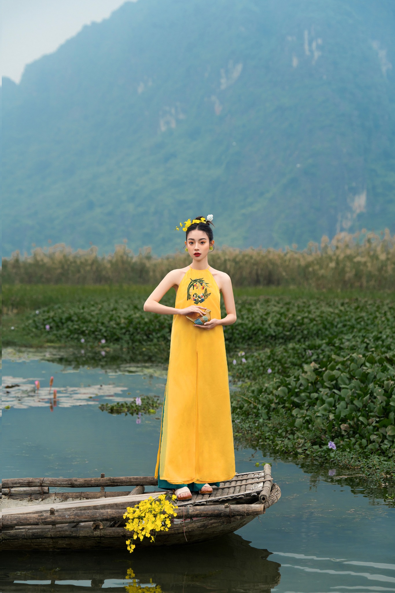 áo dài thiết kế xuân may bằng chất liệu tafta fine loại 1, đính kết hoa thủ công tà áo, tay tơ lỡ loe, quần lụa vàng