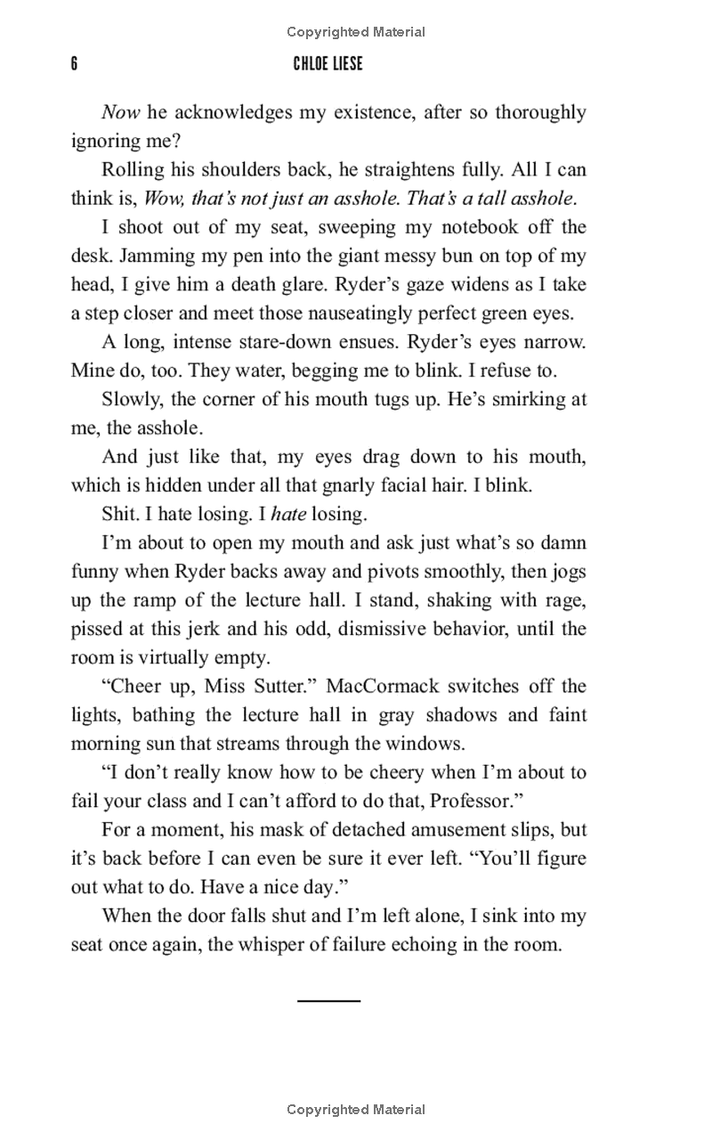Rather than give me the lecture notes I missed like every other instructor I've had, my asshole professor tells me to get them from the silent, surly flannel-wearing mountain man sitting next to me in class. Well, I tried. And what did I get from Ryder Bergman? Ignored. What a complete lumbersexual neanderthal. Mangy beard and mangier hair. Frayed ball cap that hides his eyes. And a stubborn refusal to acknowledge my existence.