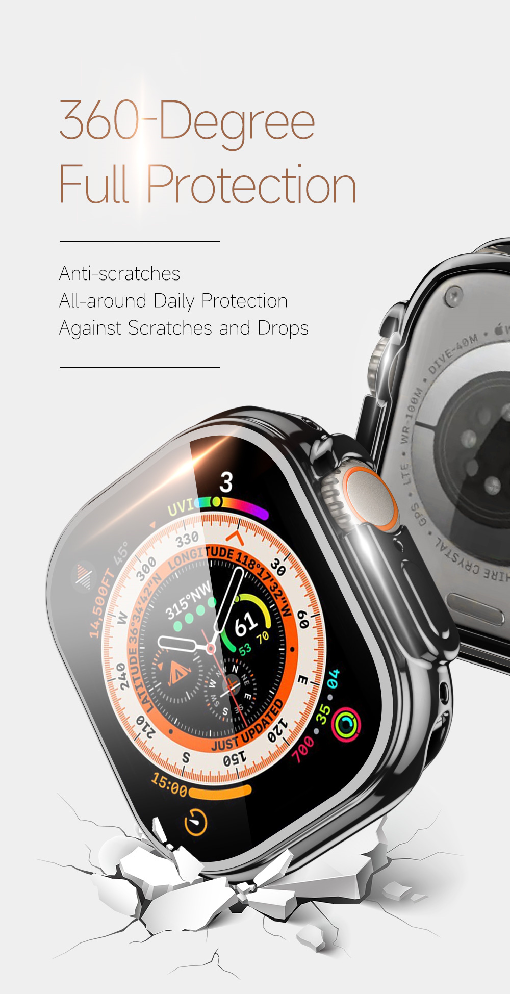 Màu sắc: Đen / Bạc Được làm từ PC mạ điện Tương thích với Apple Watch Ultra/ Ultra 2 Nó có thể bảo vệ hoàn toàn đồng hồ của bạn khỏi trầy xước, rơi, vết