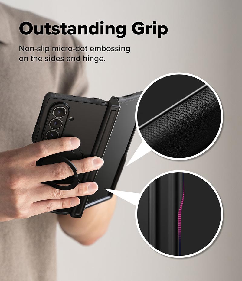 • Ốp Ringke Alles được thiết kế tích hợp cùng lúc nhiều tính năng hữu dụng: có phần bảo vệ bản lề Fold 7, có lỗ xỏ dây đeo, hỗ trợ sạc Magnetic. có chân dựng kickstand và có vòng xỏ ngón tay trợ lực.