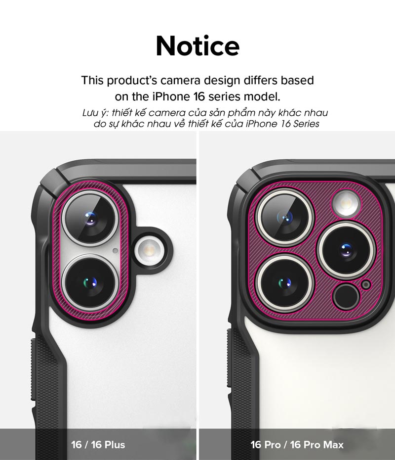 • Do thiết kế phần camera của iPhone 16/16 Plus khác với iPhone 16 Pro/16 Pro Max nên với dòng ốp Fusion X cũng có sự khác nhau ở vị trí camera. Với dòng máy iPhone 16 Pro/16 Pro Max, phần camera được thiết kế cụm nguyên khối, trong khi dòng máy iPhone 16/16 Plus thì phần camera khoét lỗ.
