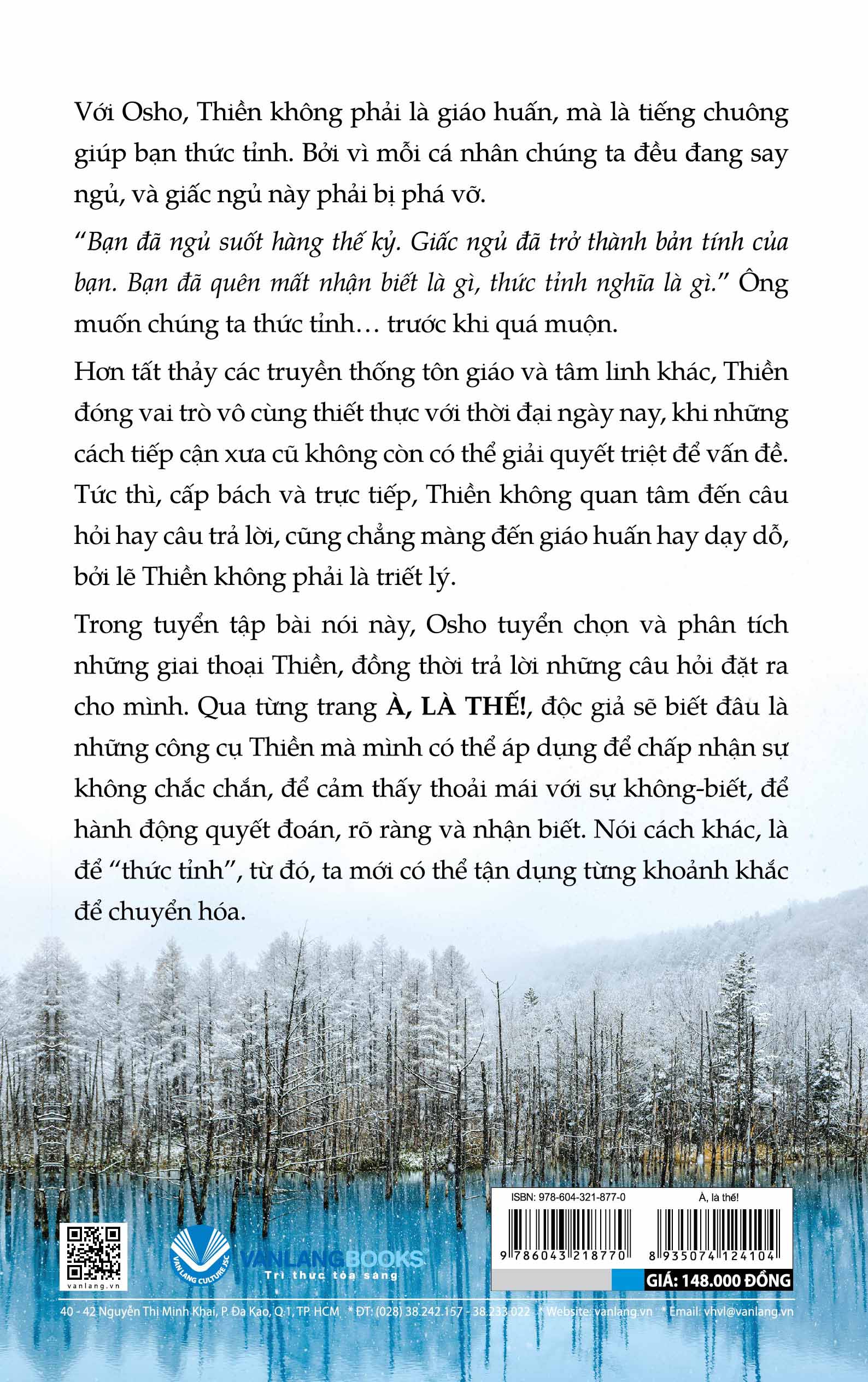 Trong tuyển tập bài nói này, Osho tuyển chọn và phân tích những giai thoại Thiền, đồng thời trả lời những câu hỏi đặt ra cho mình. Qua từng trang À, là thế!, độc giả sẽ biết đâu là những công cụ Thiền mà mình có thể áp dụng để chấp nhận sự không chắc chắn, để cảm thấy thoải mái với sự không-biết, để hành động quyết đoán, rõ ràng và nhận biết. Nói cách khác, là để “thức tỉnh”, từ đó, ta mới có thể tận dụng từng khoảnh khắc để chuyển hóa.