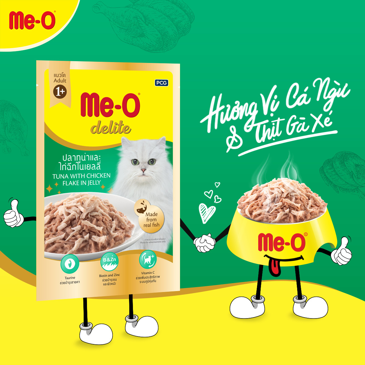 Me-O Delite cung cấp thức ăn ngon bổ dưỡng, có đầy đủ các thành phần chất lượng cao, cho những chú mèo yêu quý của bạn. Chúng tôi sử dụng phần tốt nhất của cá tươi để phục vụ sự thèm ăn của mèo. Bạn có thể tự tin rằng mèo của bạn sẽ trở nên hạnh phúc và khỏe mạnh. Nhiều loại hương vị có sẵn và sẵn sàng là một phần trong bữa ăn hoàn hảo của mèo. Khi mèo của bạn dùng thử Me-O Delite, chúng tôi đảm bảo rằng chúng sẽ yêu cầu nhiều hơn. Chúng tôi khuyên bạn nên trộn Me-O Delite với thức ăn cho mèo khô Me-O vì nó sẽ cao cấp cho bữa ăn của mèo. Bữa ăn của mèo sẽ không còn là bữa ăn bình thường nữa.